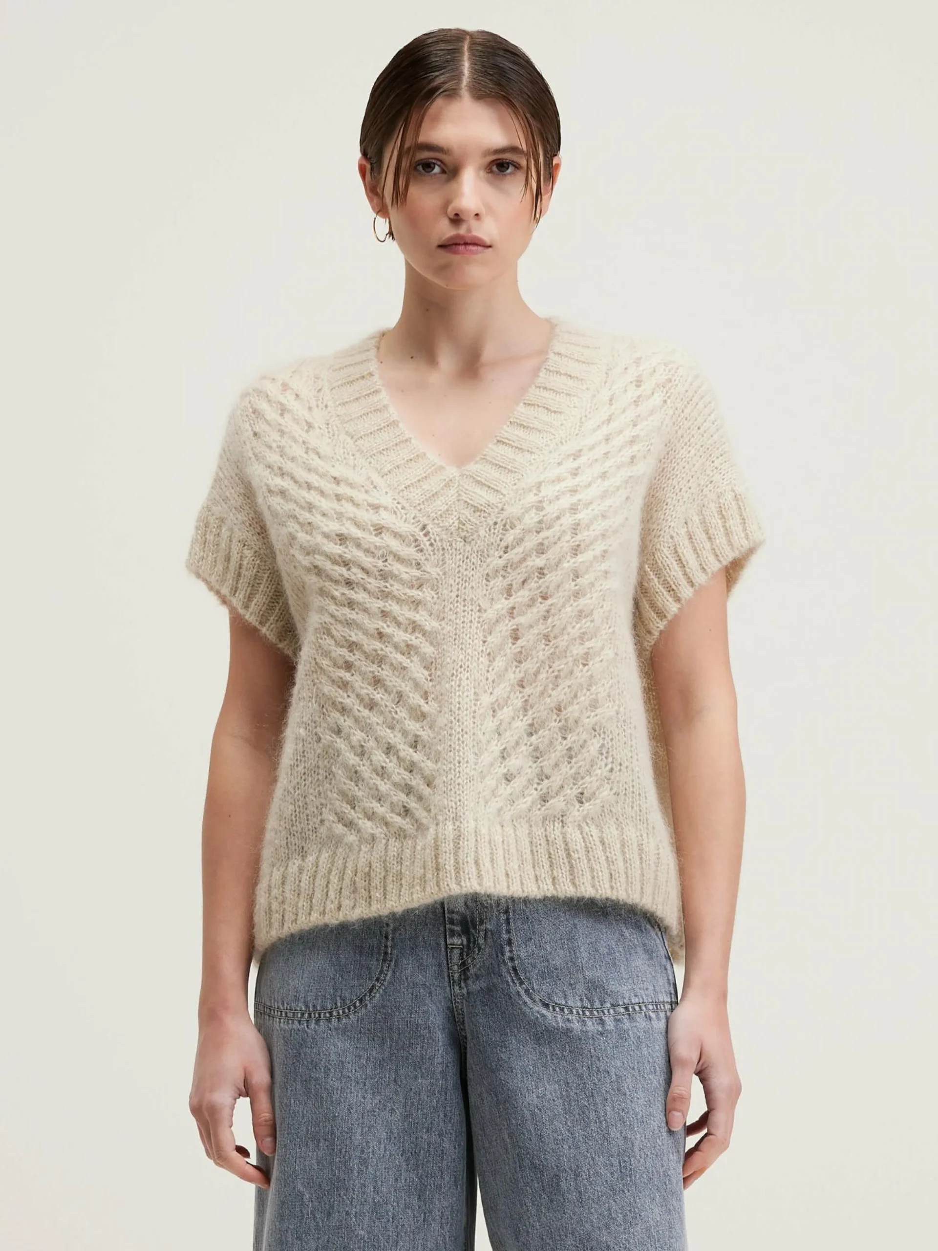 Lichte, oversizede, zandkleurige jumper zonder mouwen, met kabeldetails.