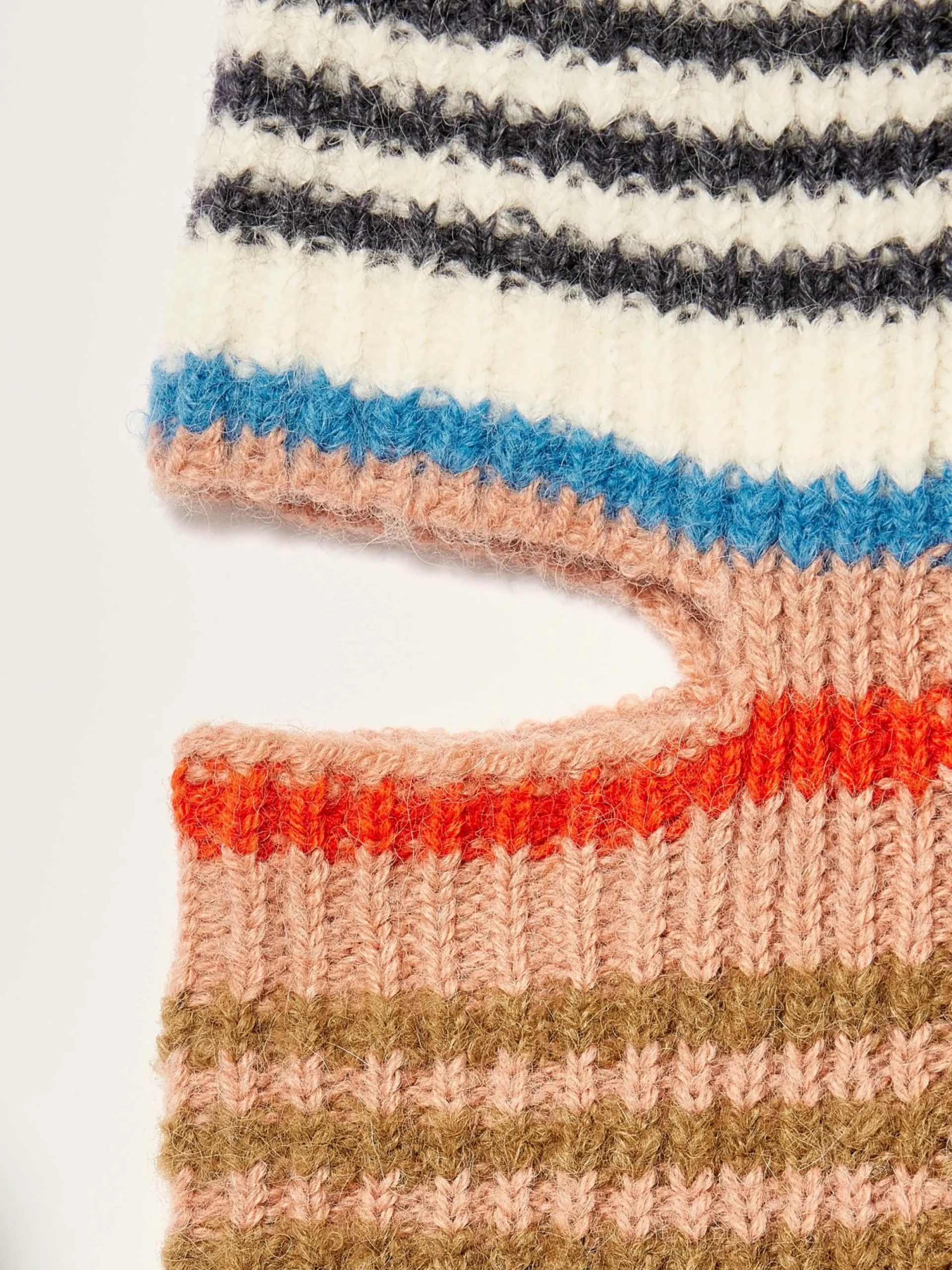 Balaclava die het hele gezicht bedekt, met veelkleurige, ribgebreide strepen.