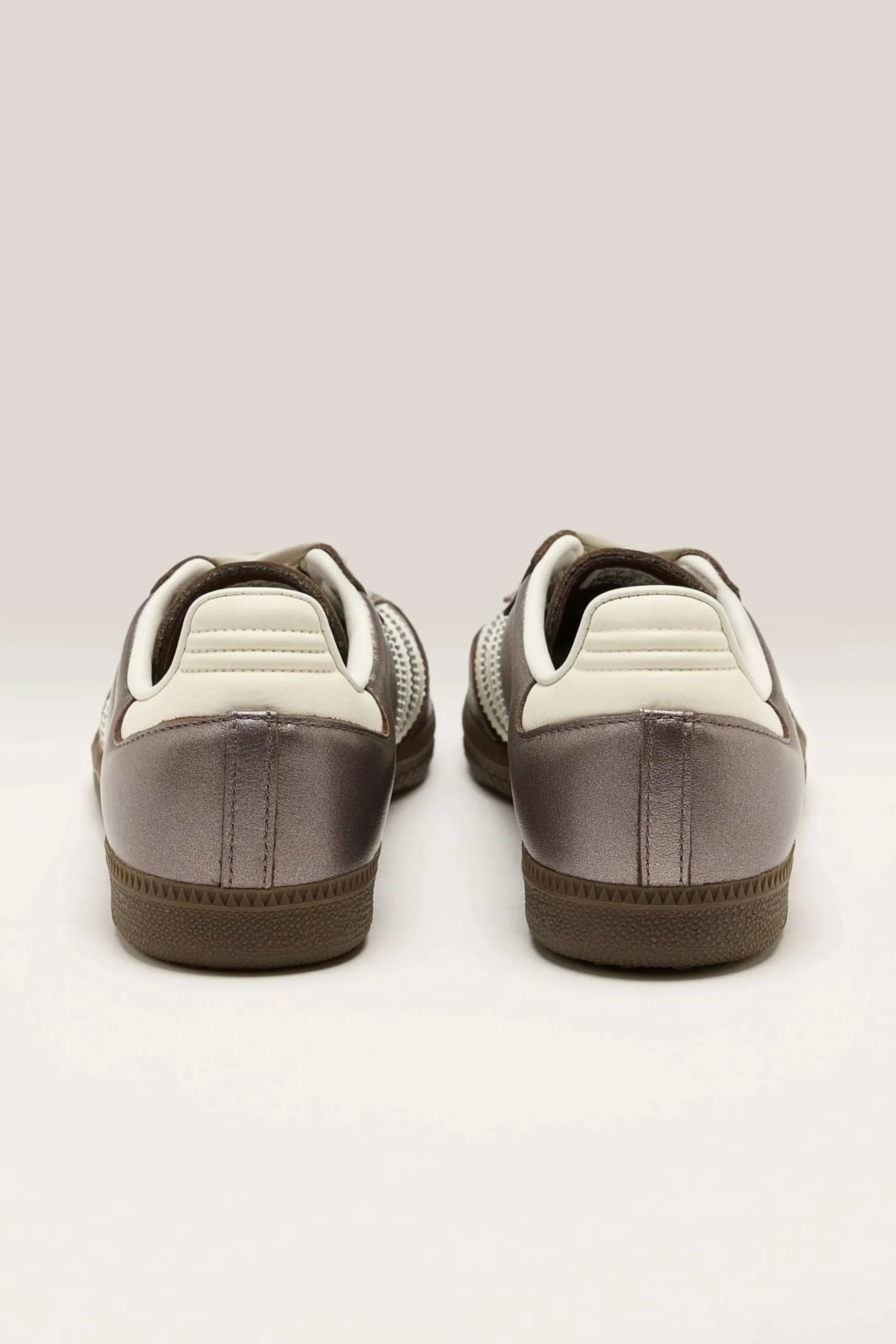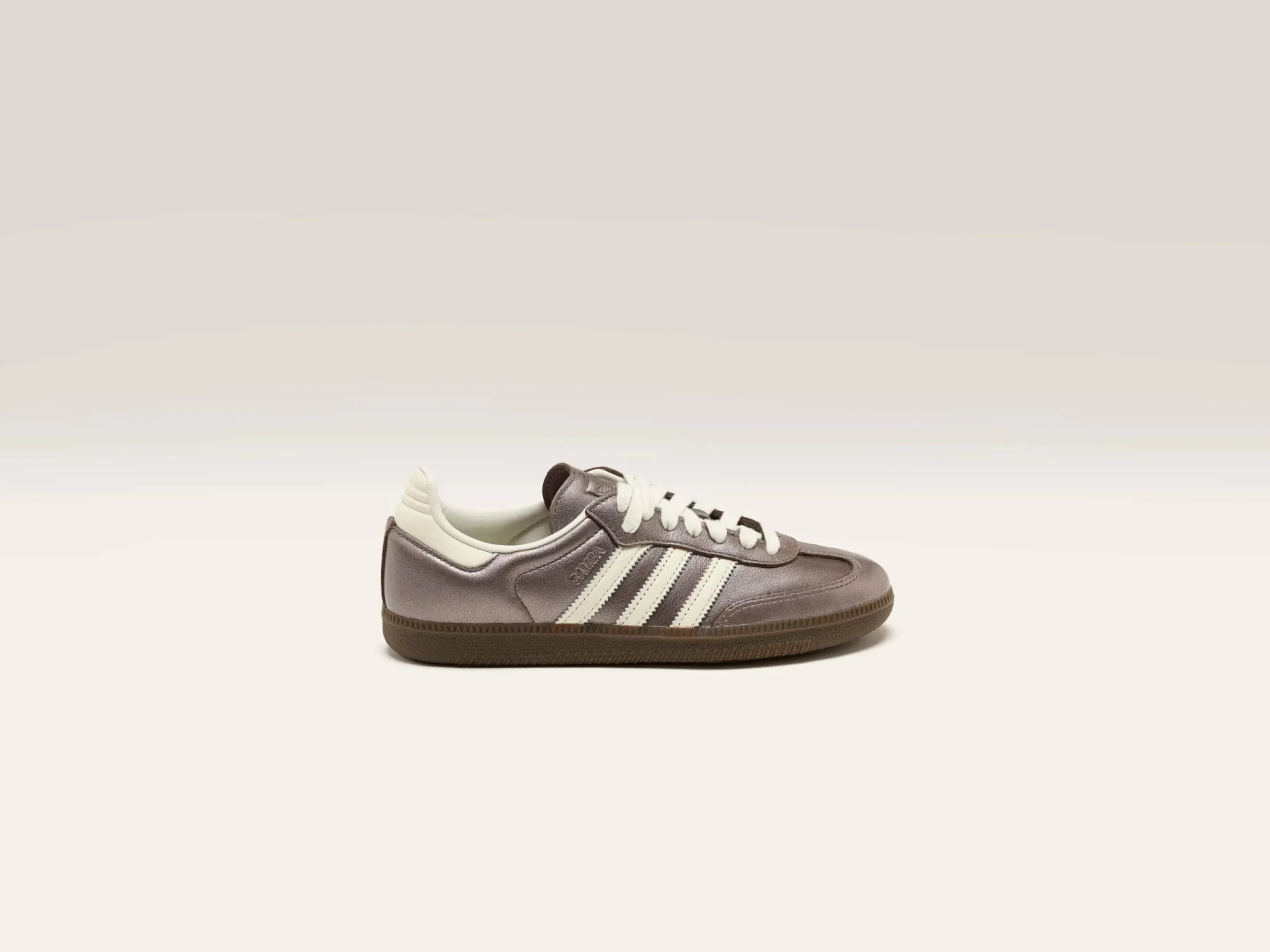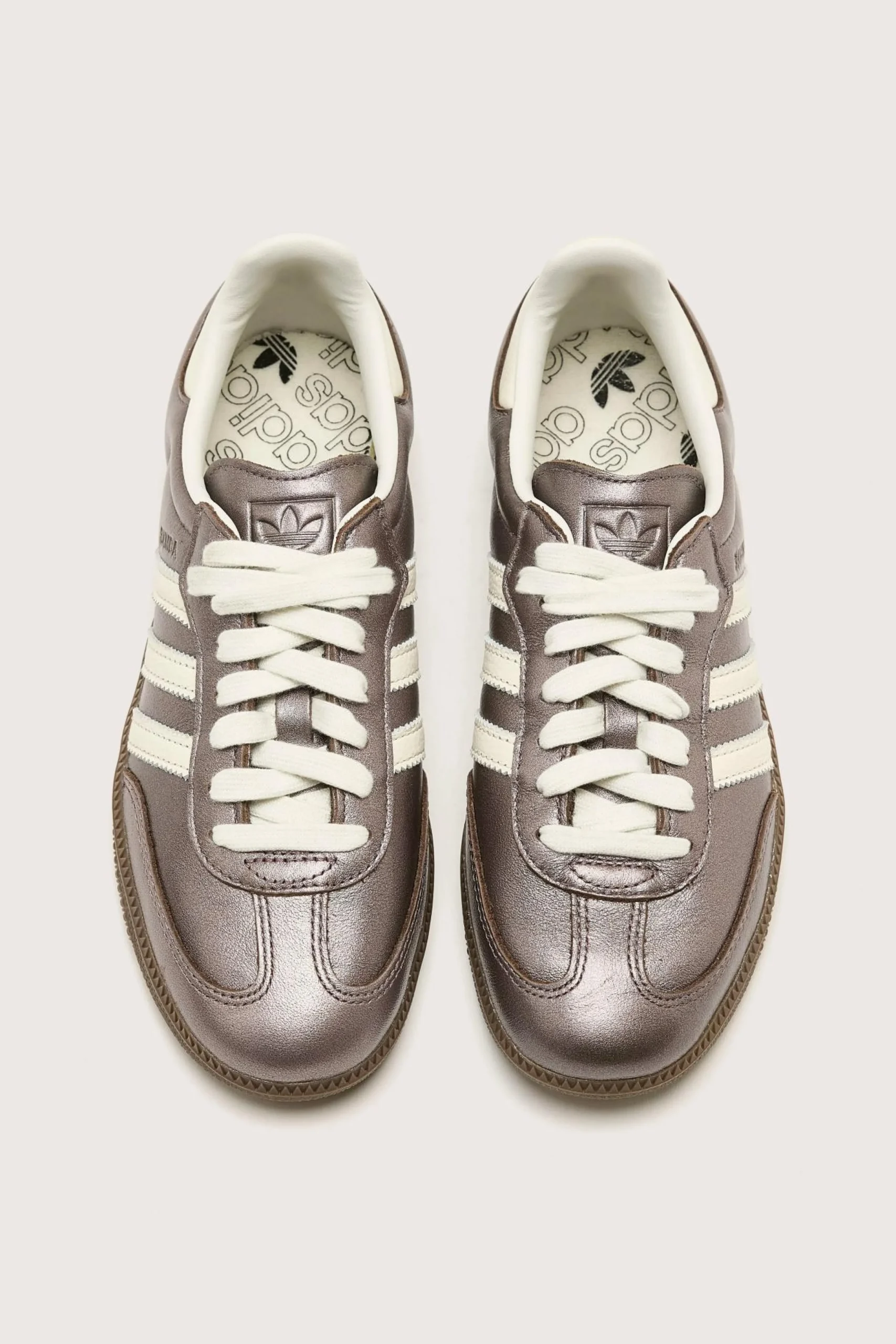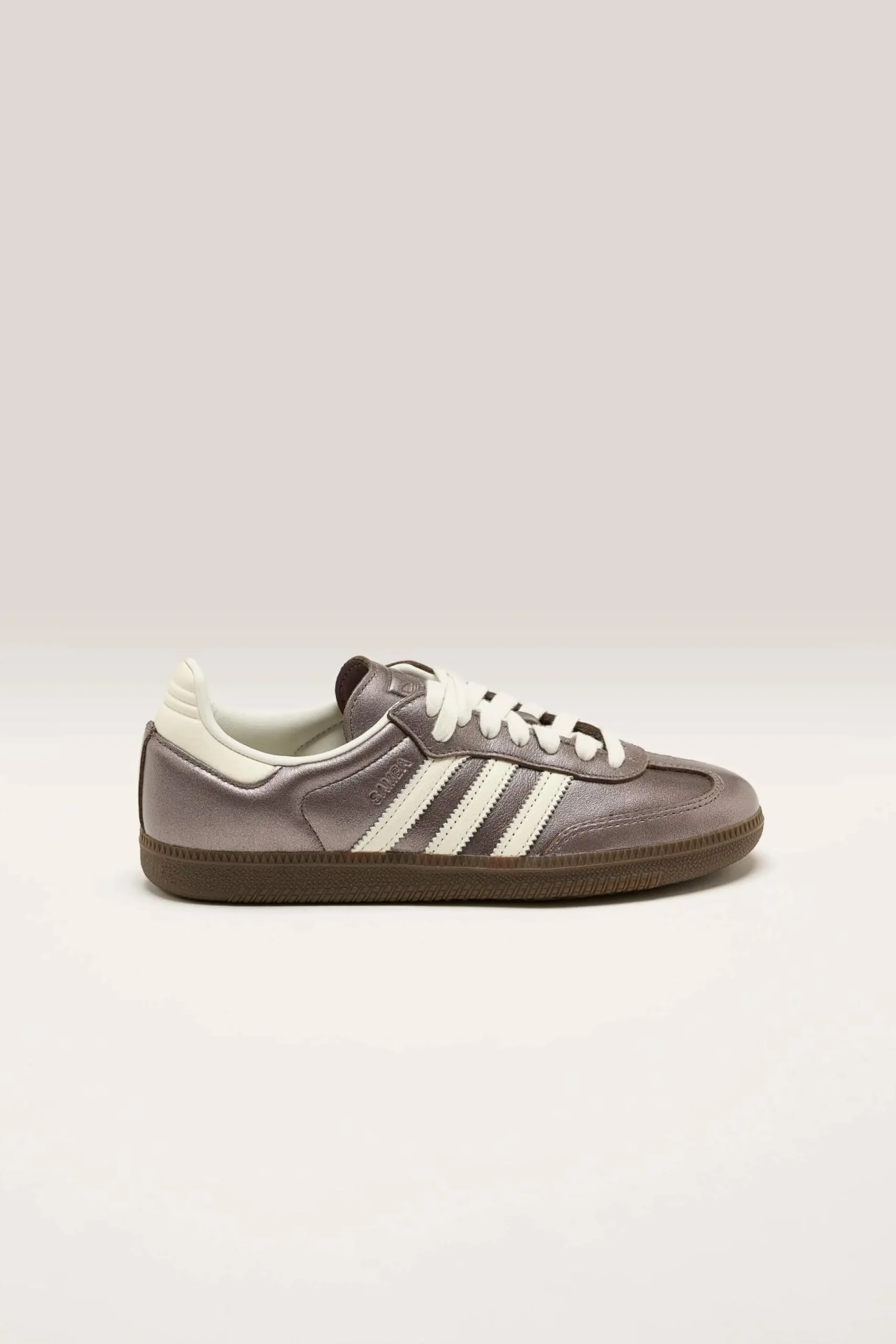 The Adidas Samba OG legacy sneakers feature a smooth leather upper with a high-shine metallic finish in a low-profile silhouette.