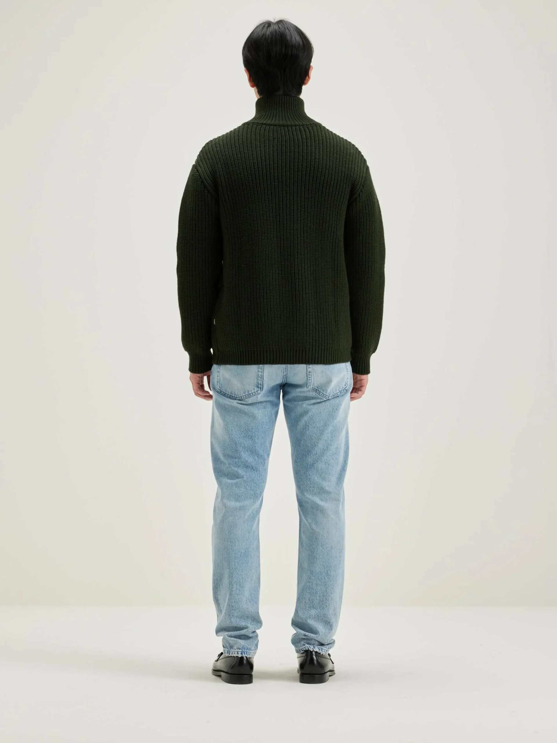 Comfortabele cardigan met ritssluiting vooraan, van olijfgroene, grove wol.