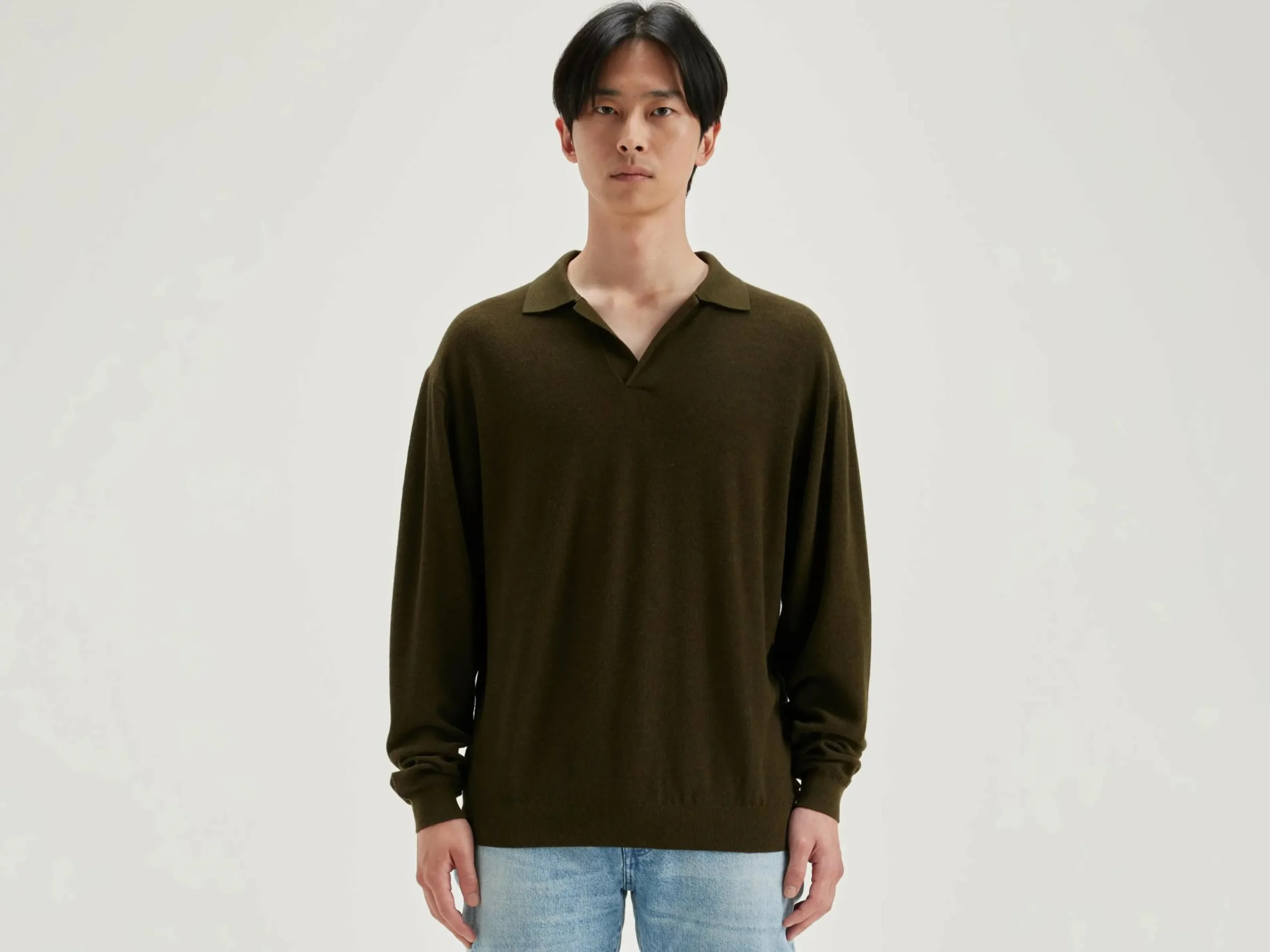 Comfortabele sweater in polostijl, van olijfgroene merinowol.