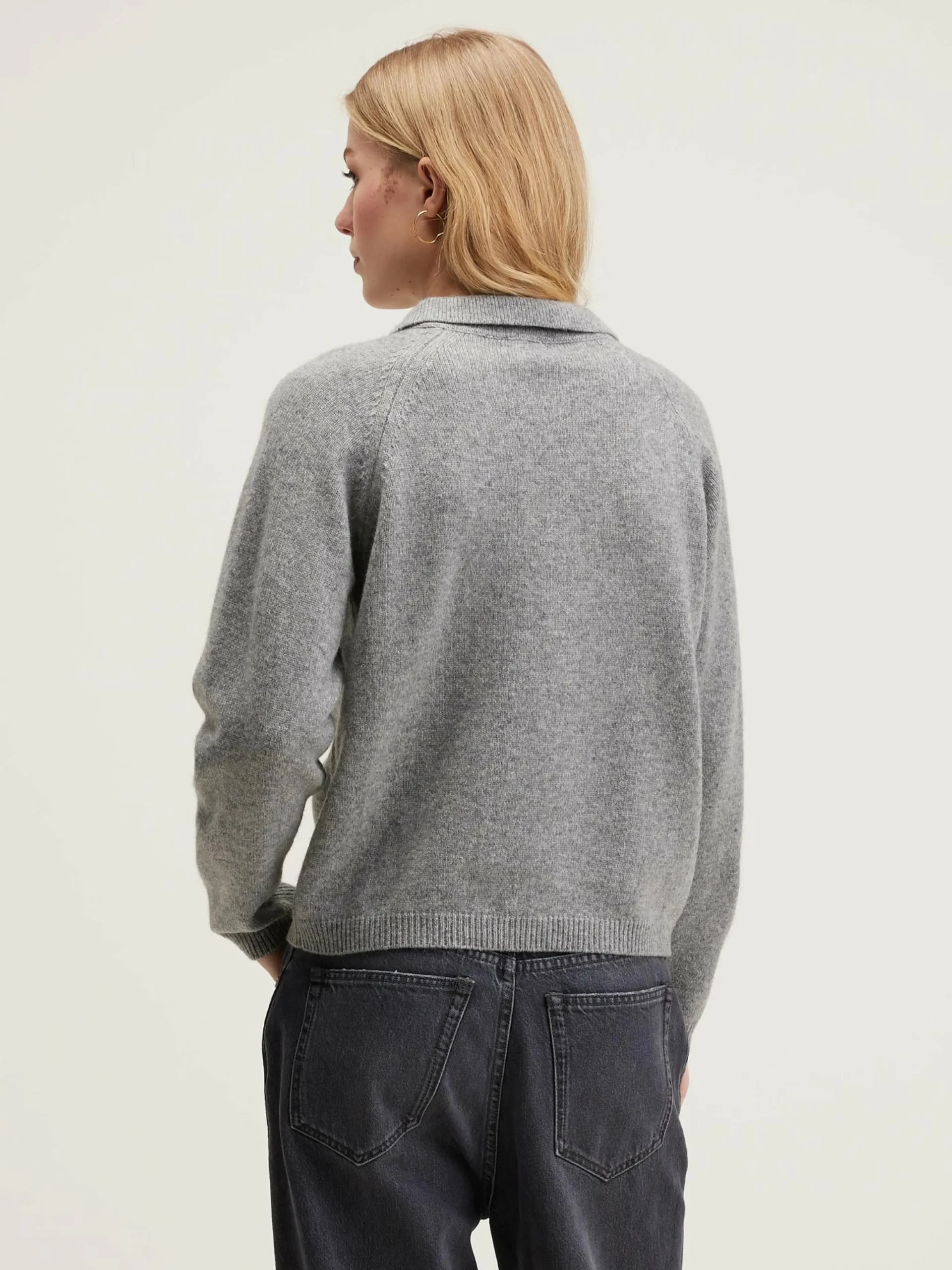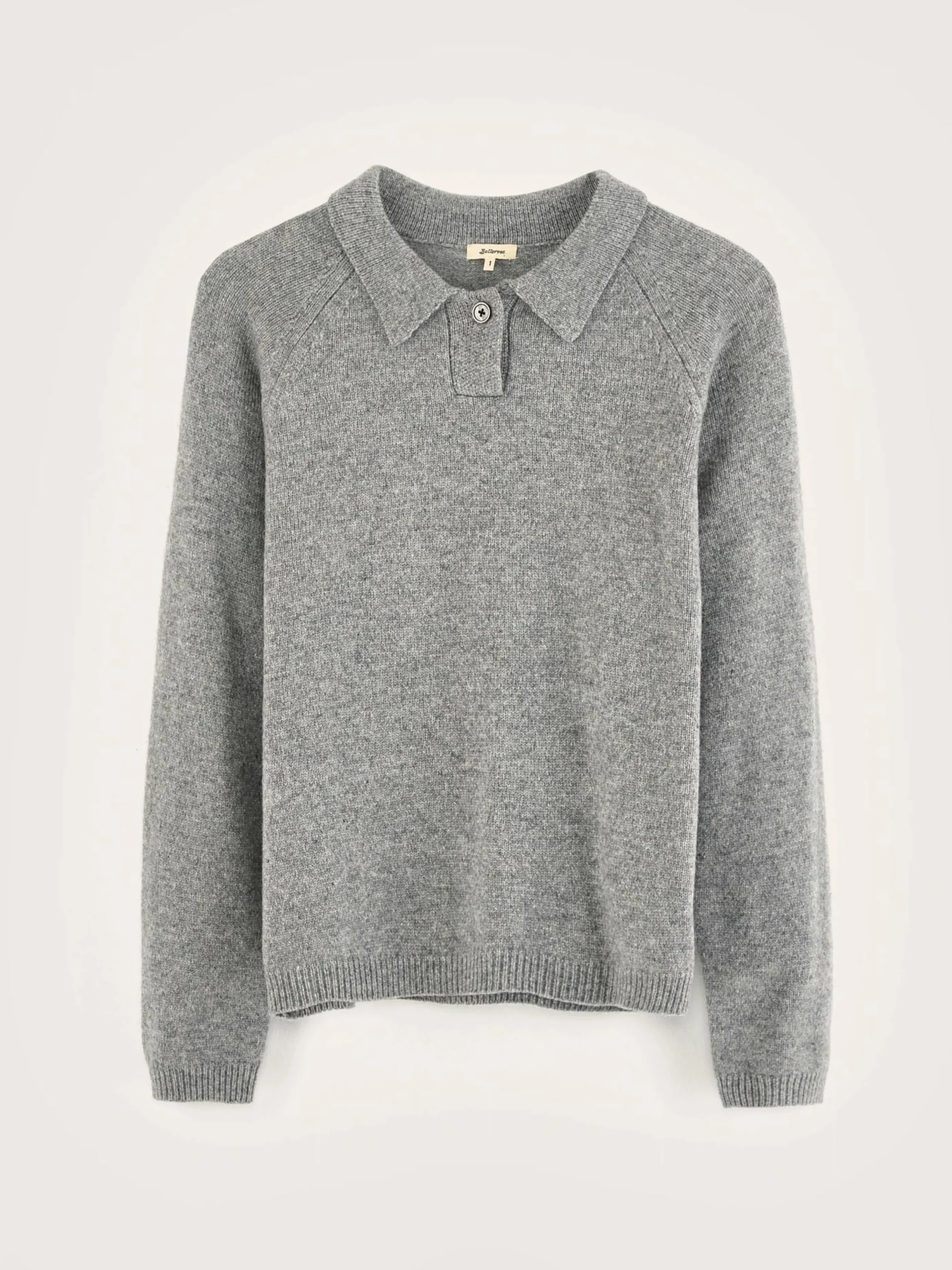 Klassieke, grijze polosweater met raglanmouwen.