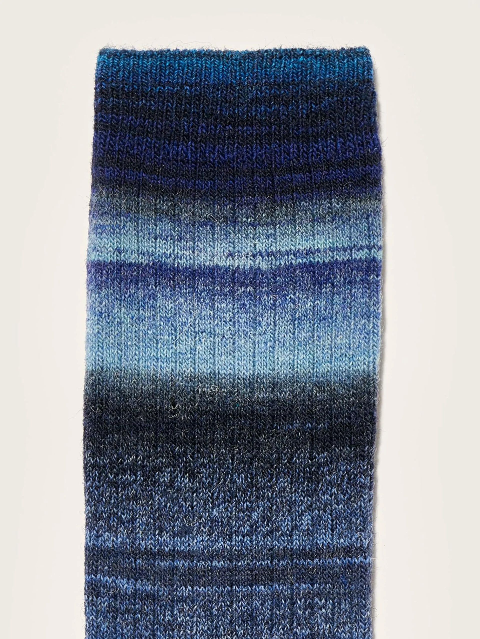 Ribgebreide sokken van meerkleurig garen, met schakeringen van blauw en contrasterende tenen en hielen.