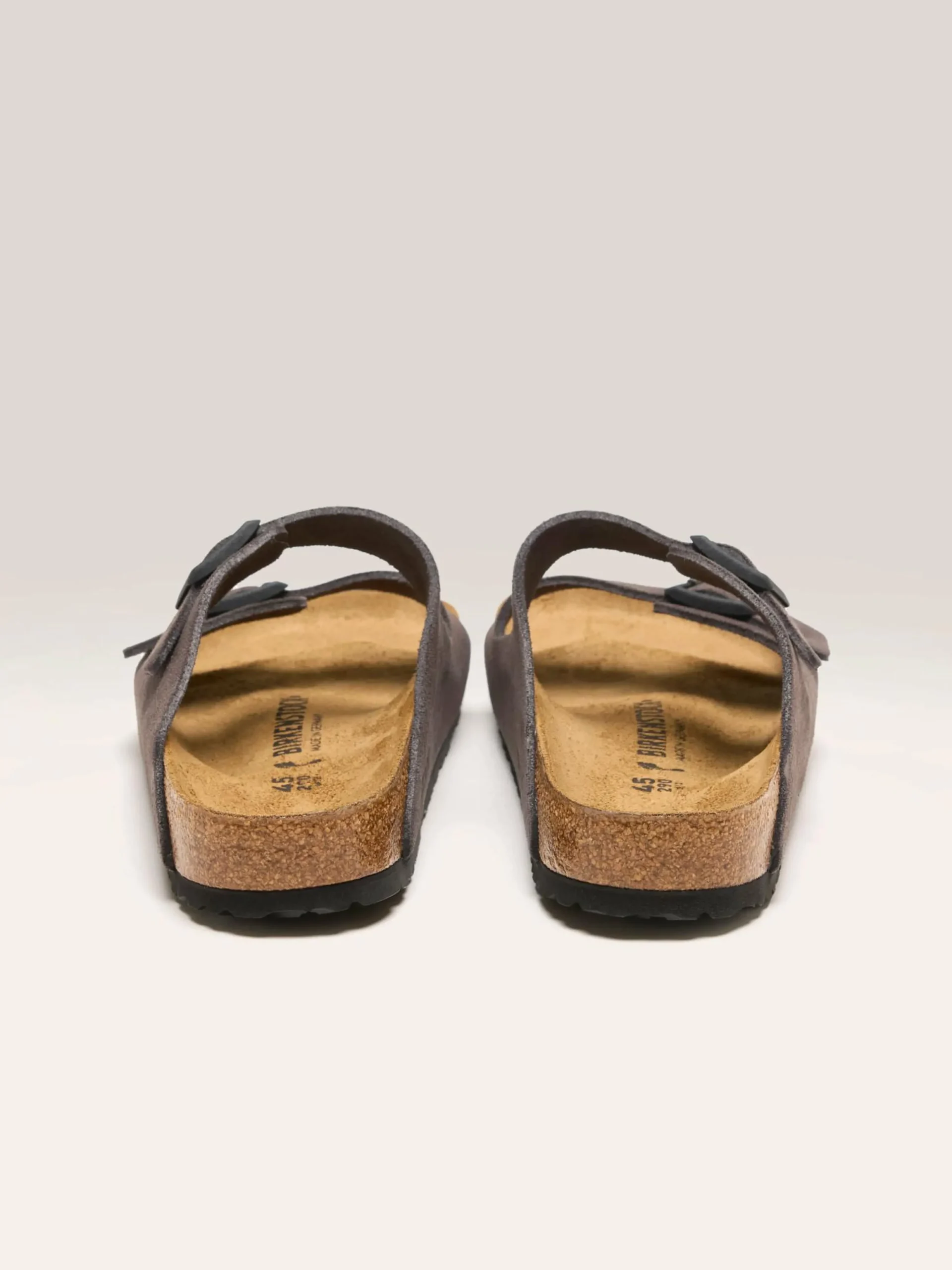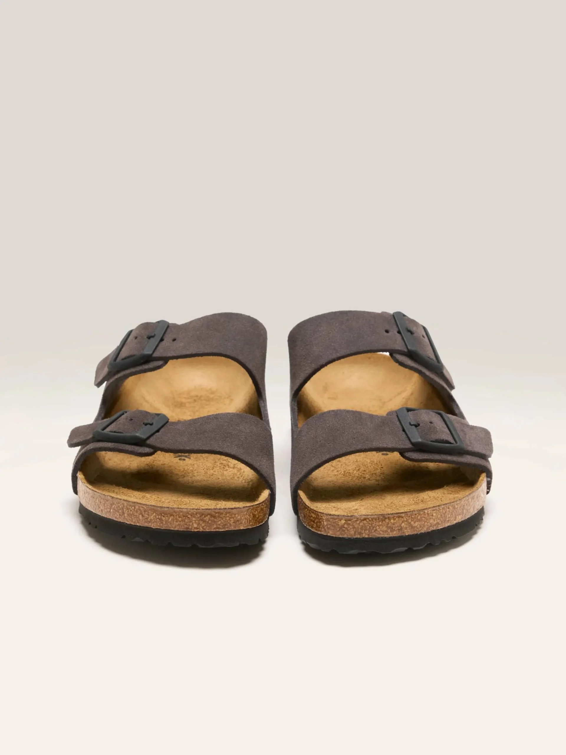 De Birkenstock Arizona tweebandschoenen van gespleten leder en suède hebben een binnenzool van natuurlijk leder met een kurken voetbed.