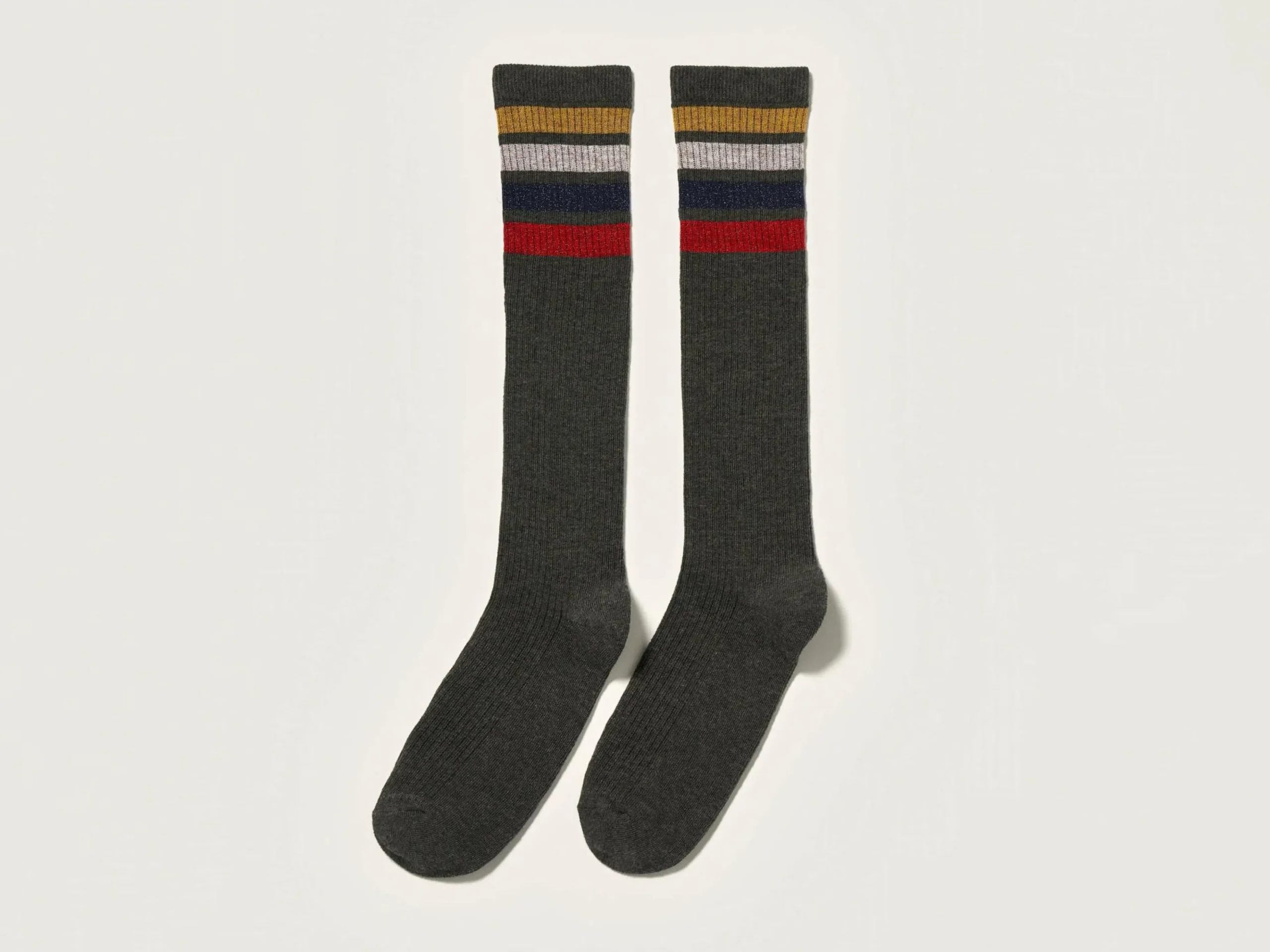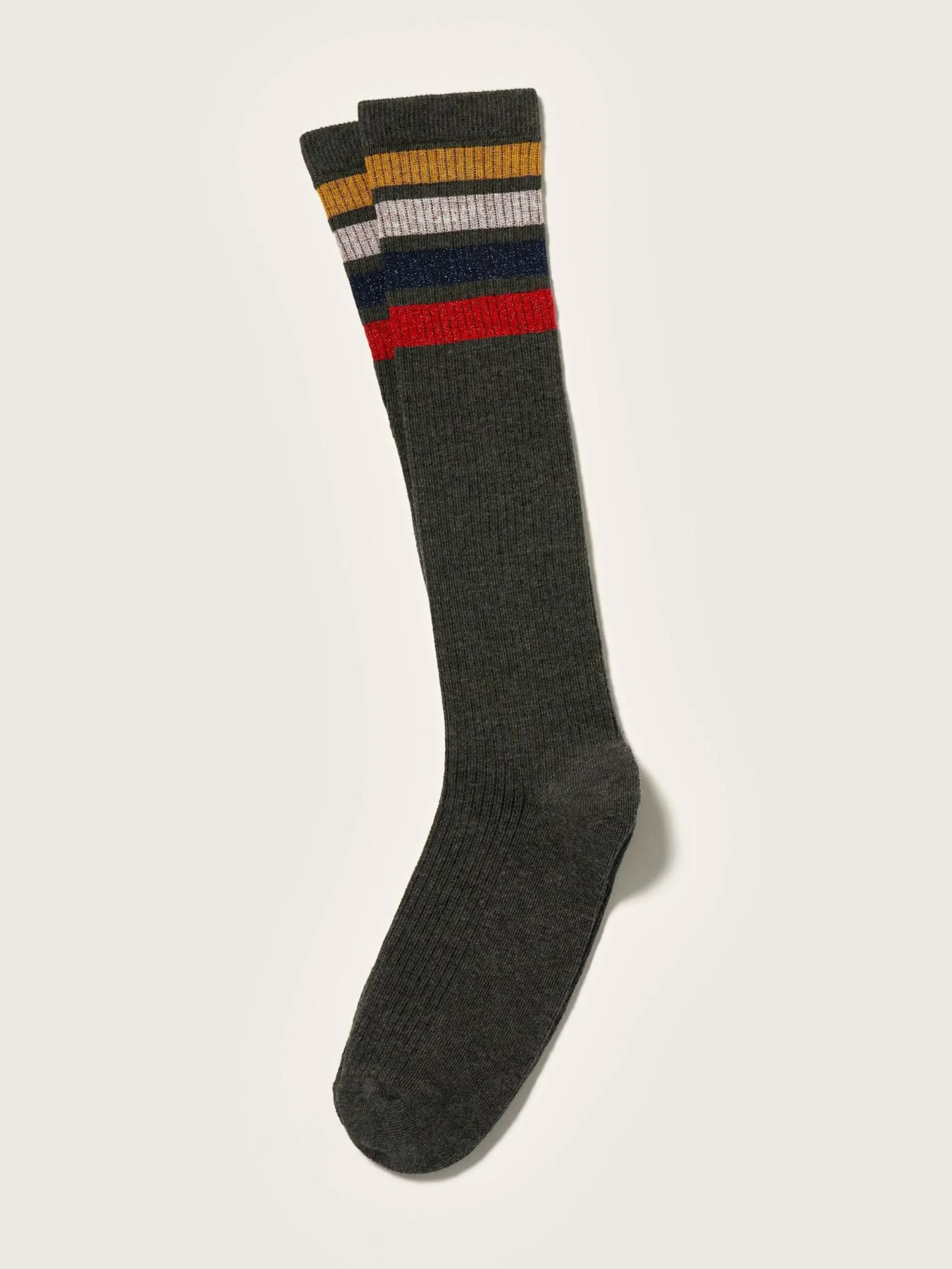 Donkergrijze kniekousen met lurexstrepen.