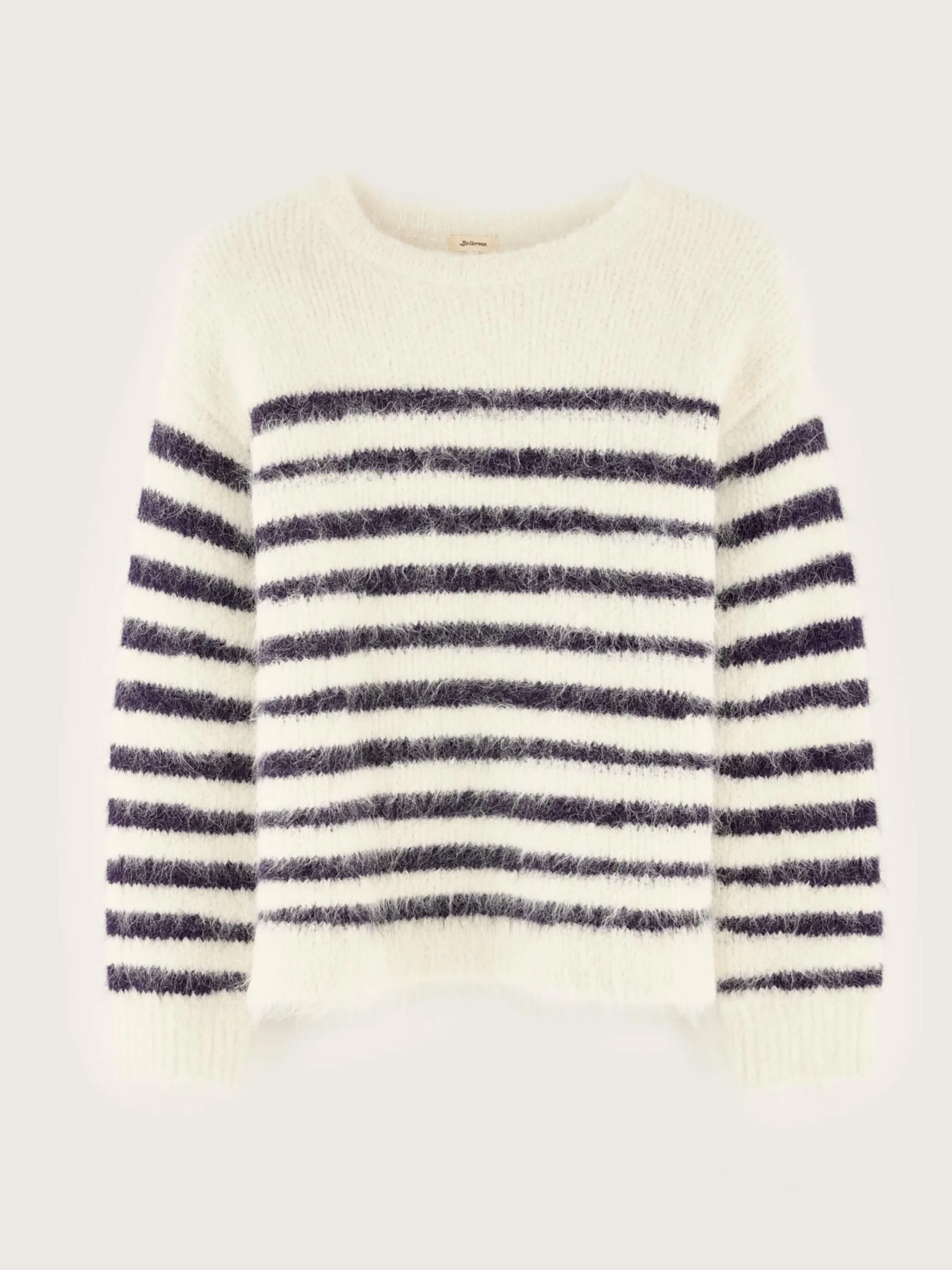 Klassieke trui met onregelmatige marineblauwe en ivoorwitte strepen.