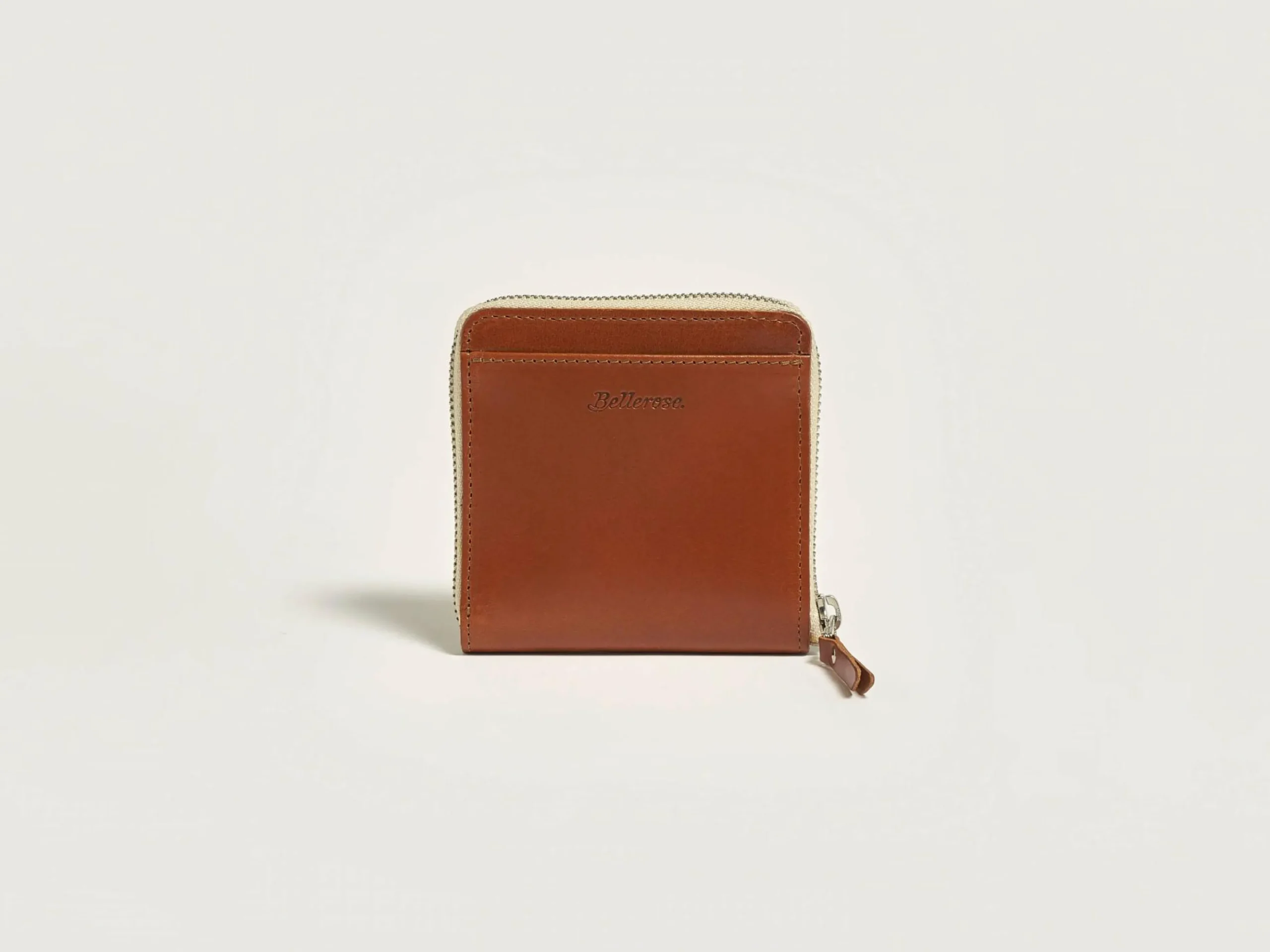 Vierkante portemonnee van glad cognac-kleurig leer met rits, meerdere kaartsleuven en een muntvak.