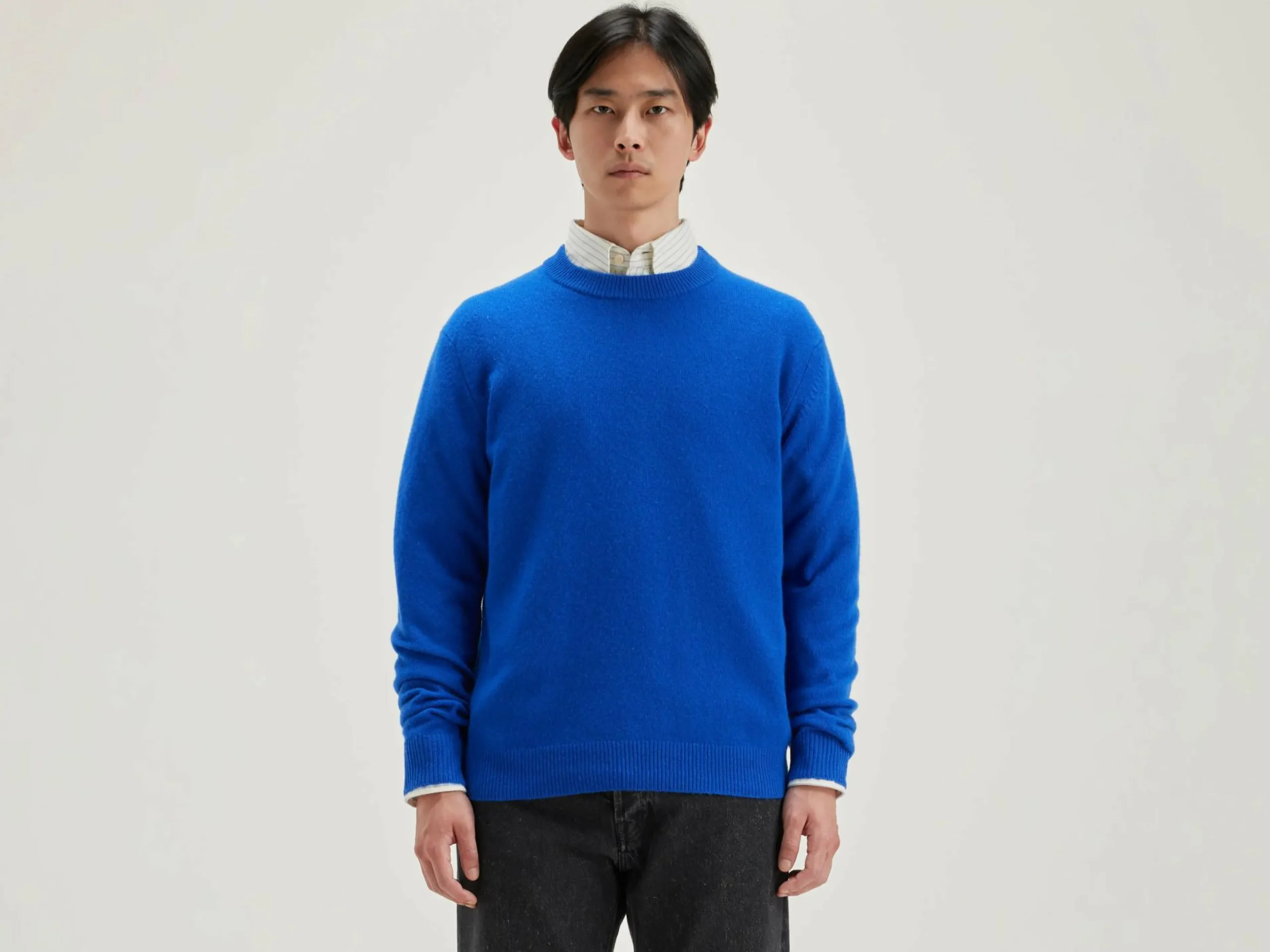 Klassieke, koningsblauwe sweater met ronde hals, van merinowol.