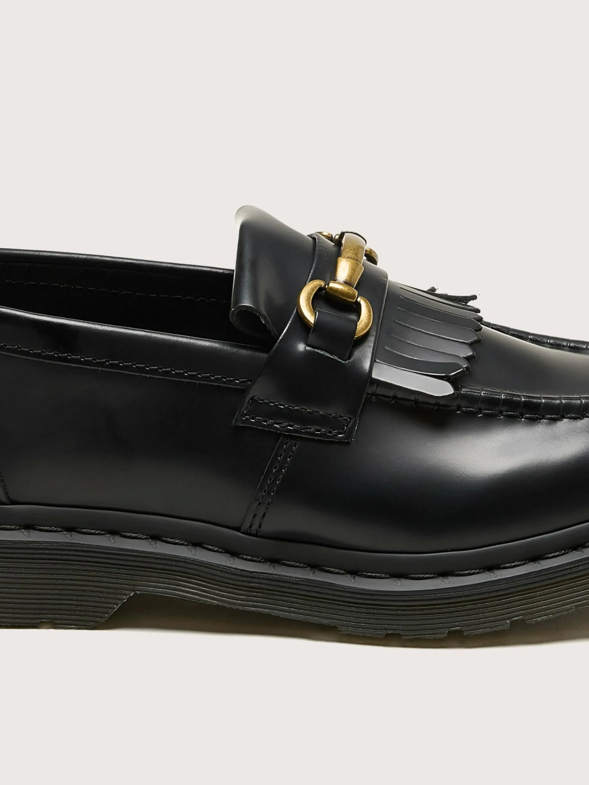 De klassieke Dr. Martens slip-on Adrian Snaffle Tassel instappers in glad, gepolijst zwart leder heeft een welt stitch en een AirWair dempende zool.