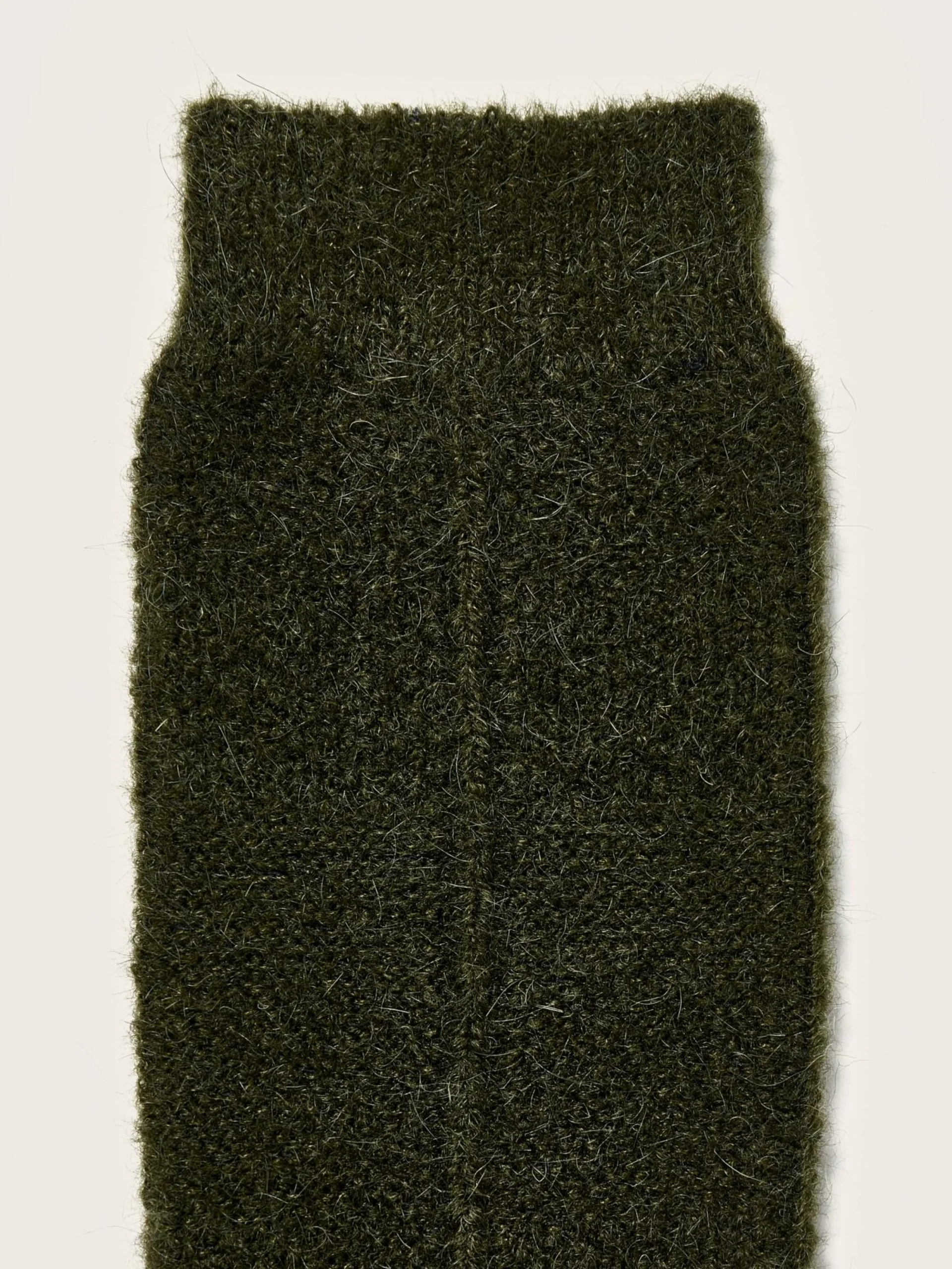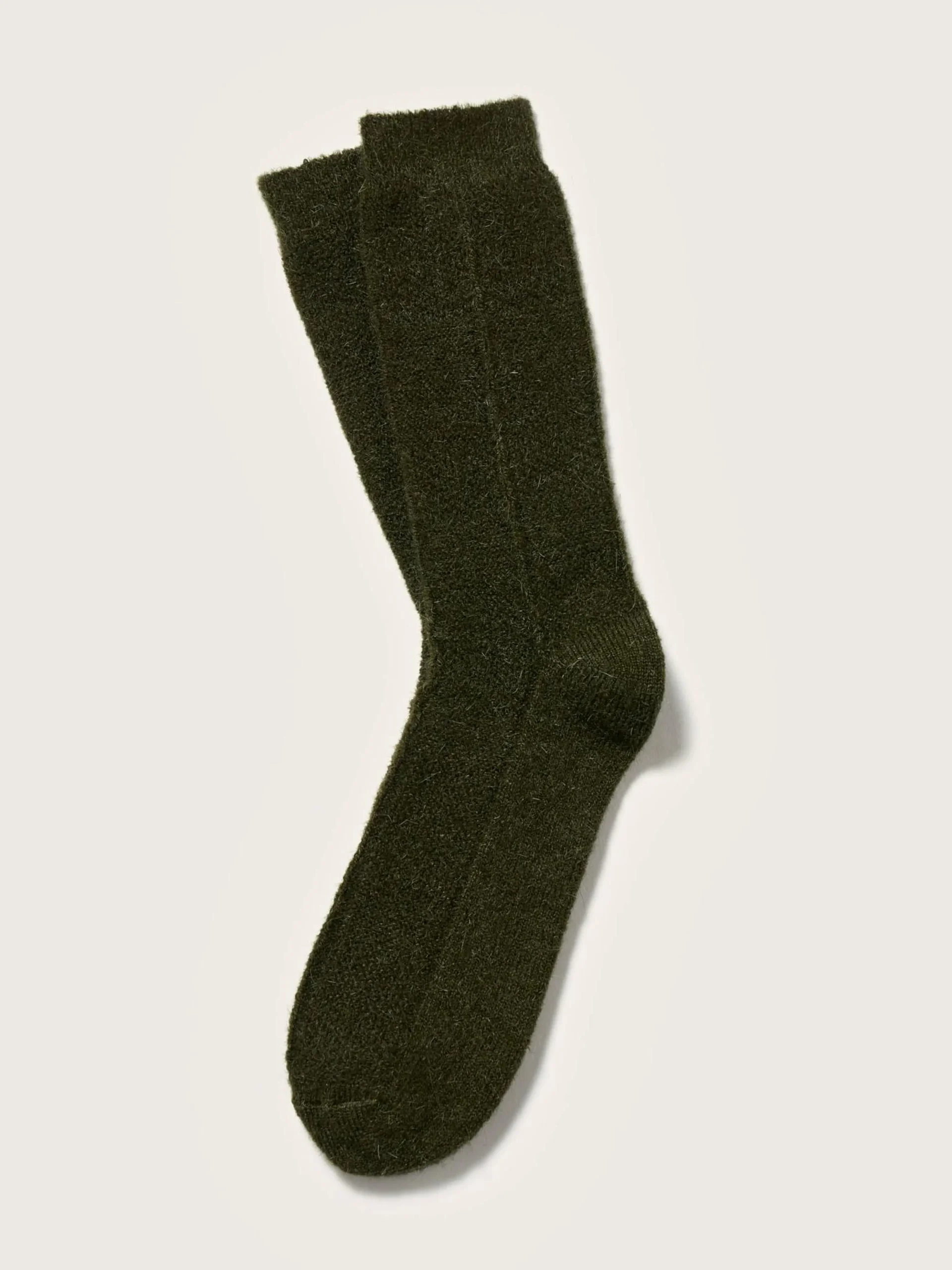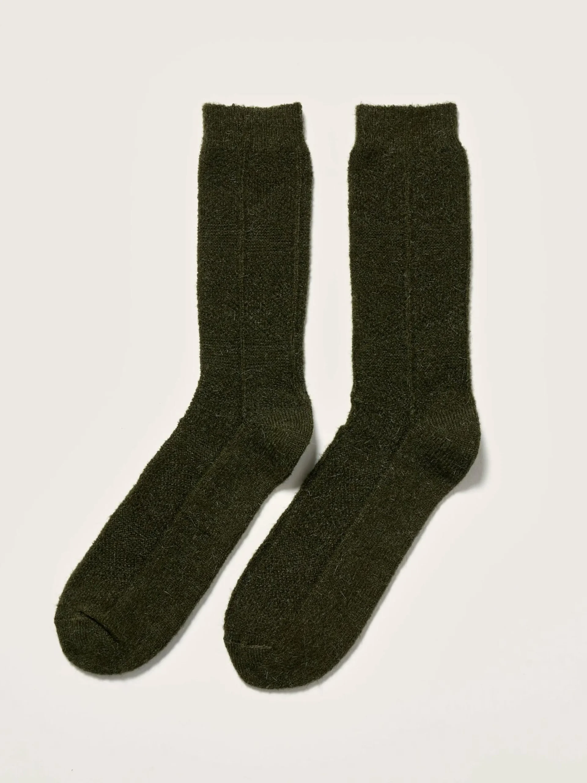 Klassieke, olijfgroene sokken met een ruitachtig patroon.