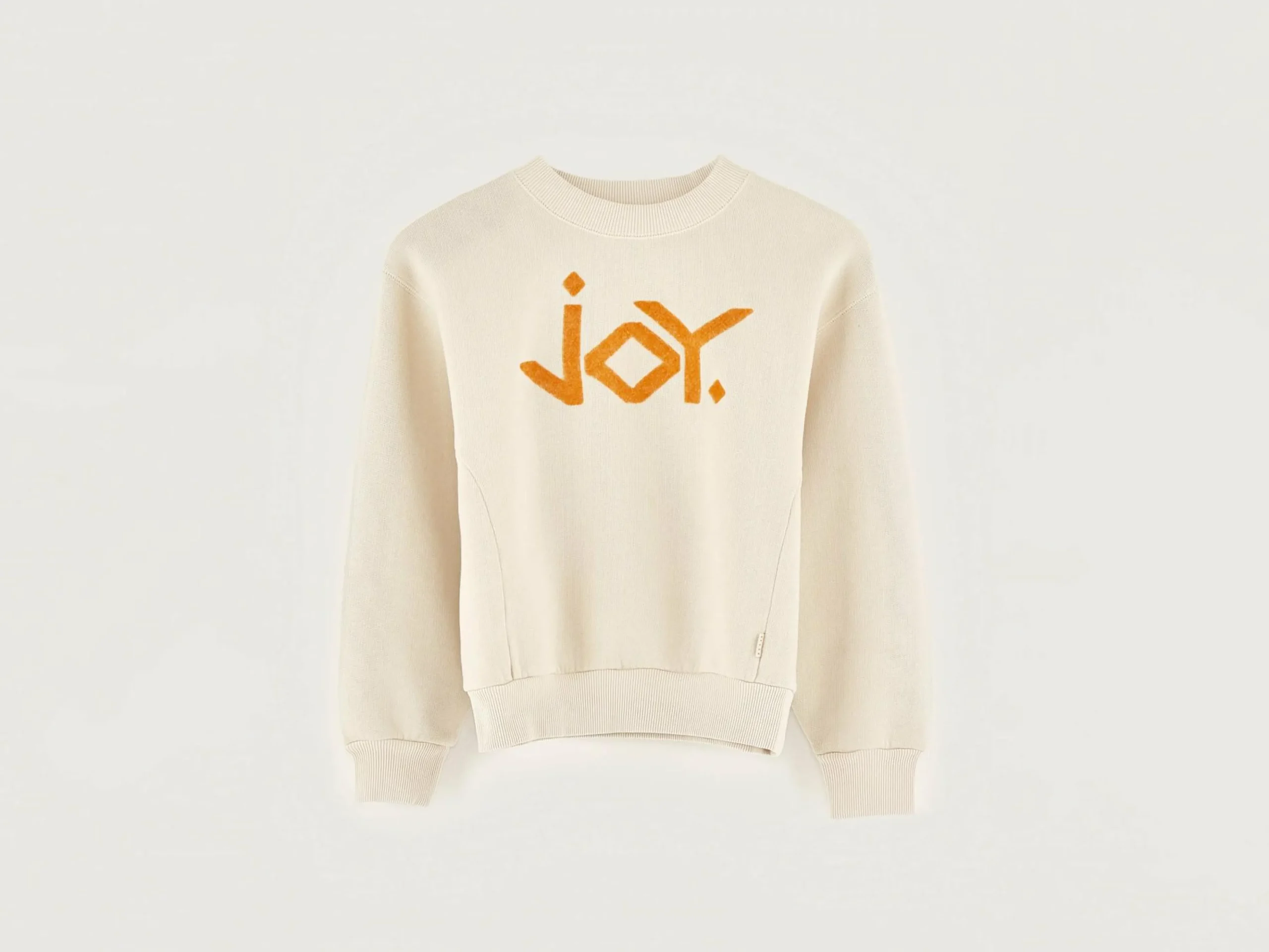 Comfortabel lichtbruin fleece sweatshirt met lange mouwen en vilten “JOY”-print.