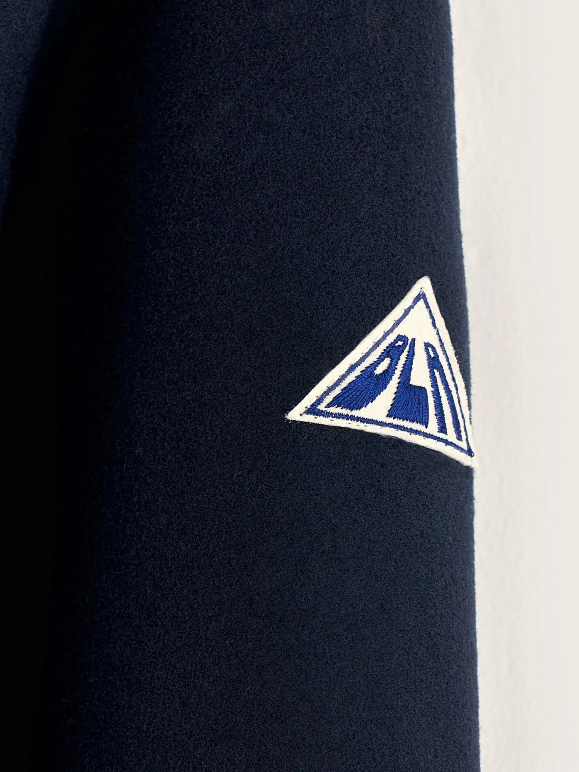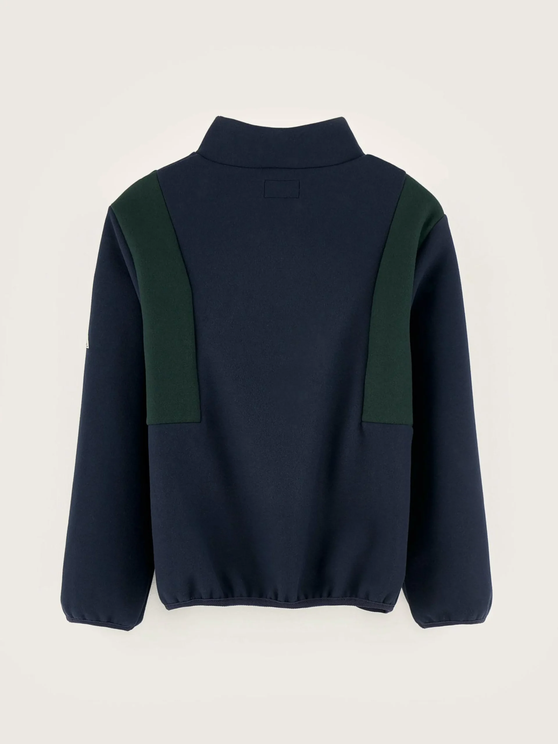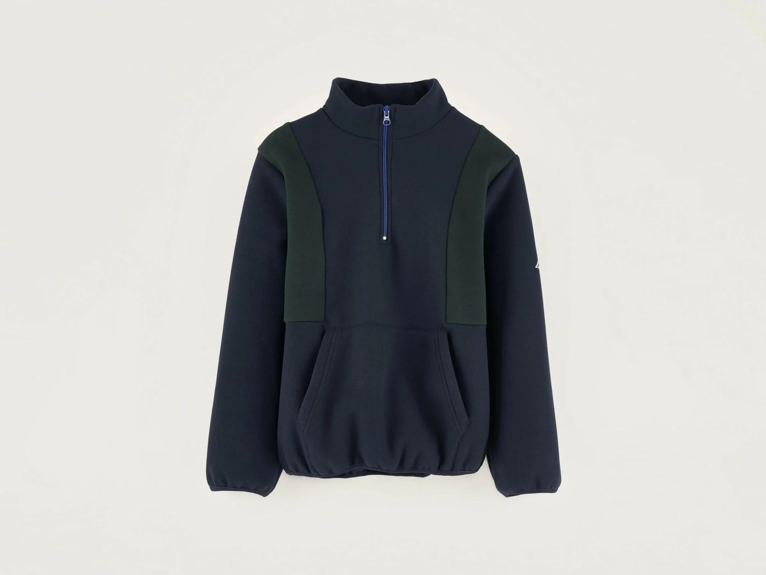 Klassiek donkerblauw polar-fleece sweatshirt, met opstaande kraag en halve ritssluiting.