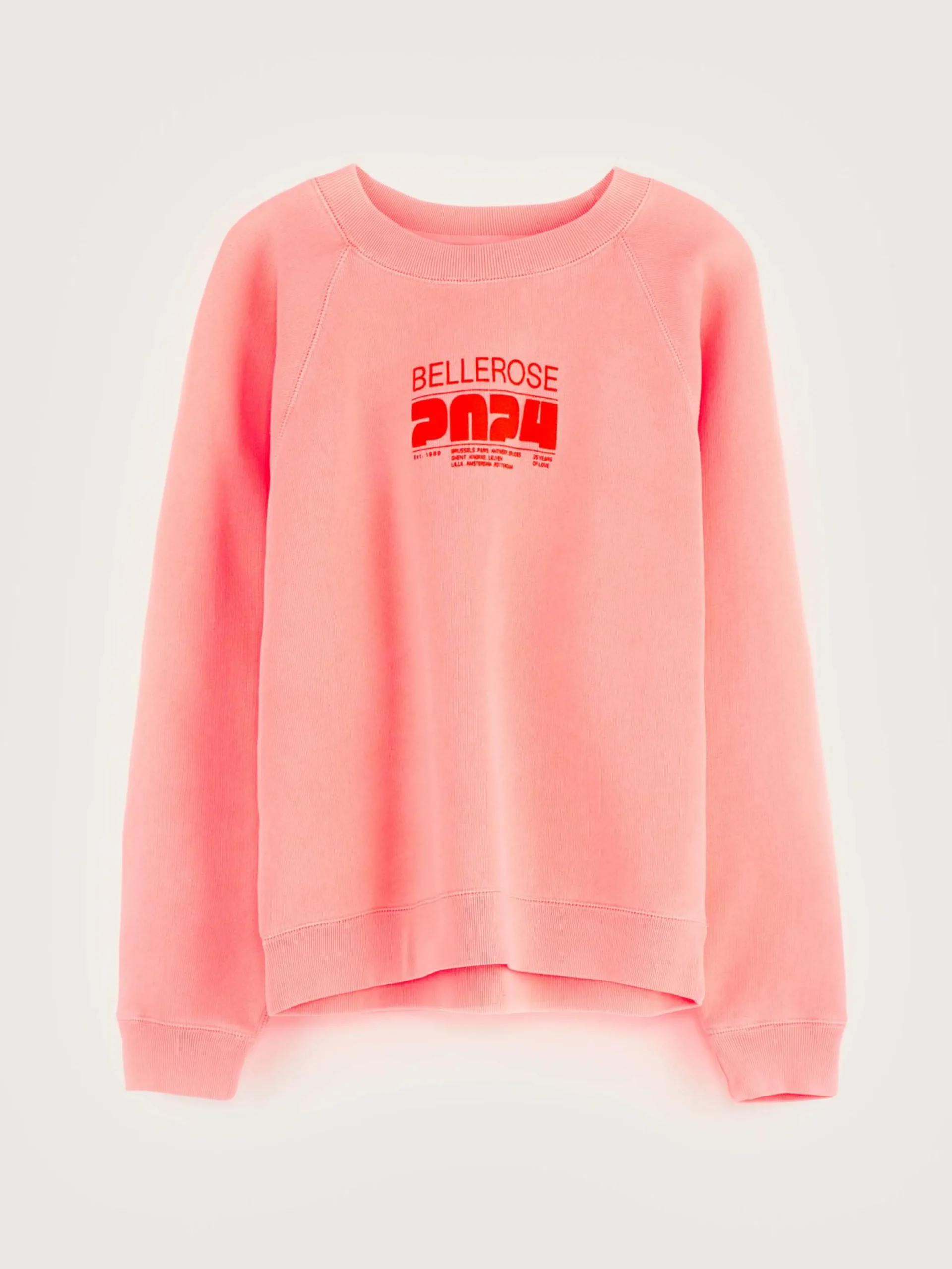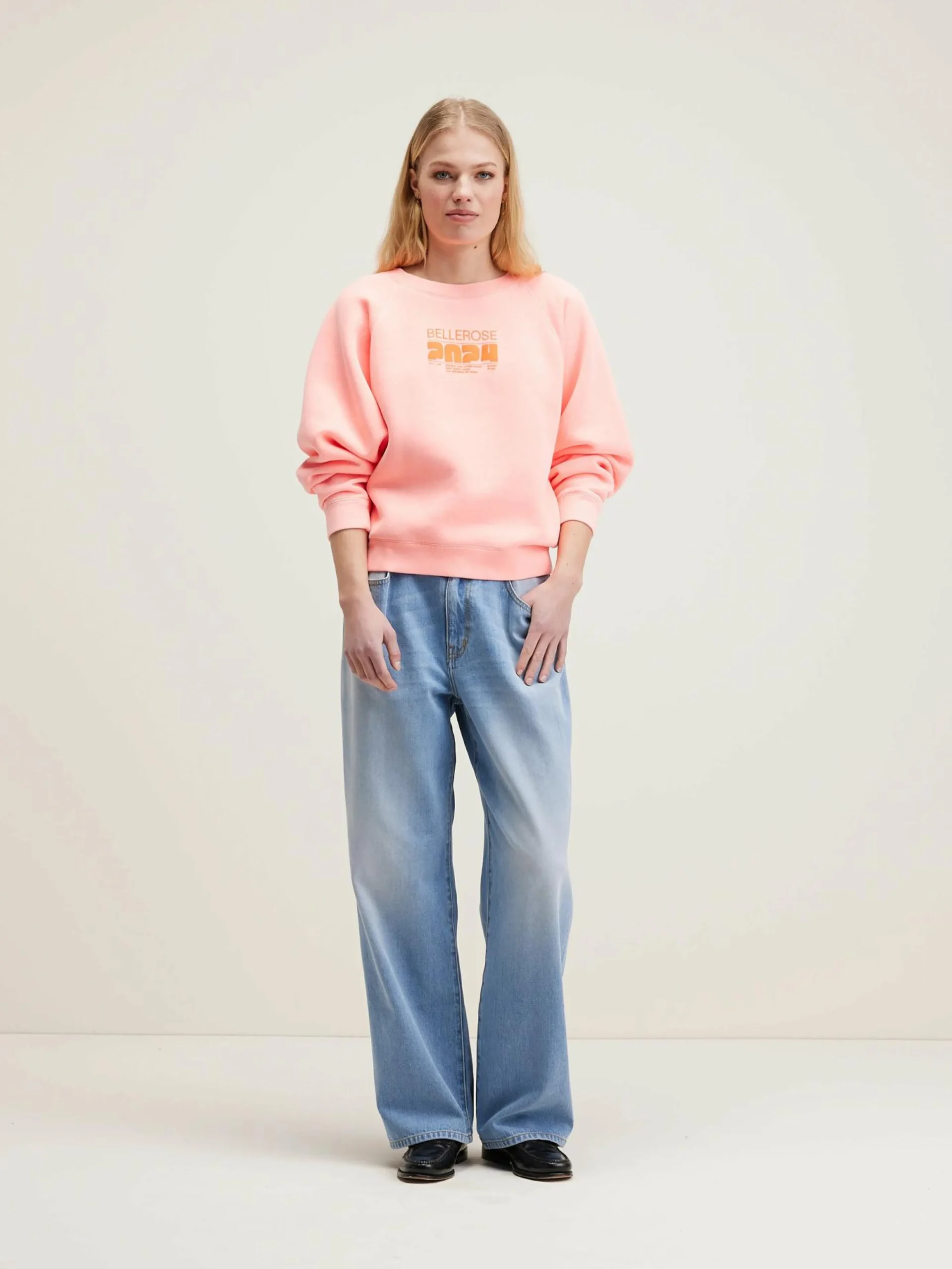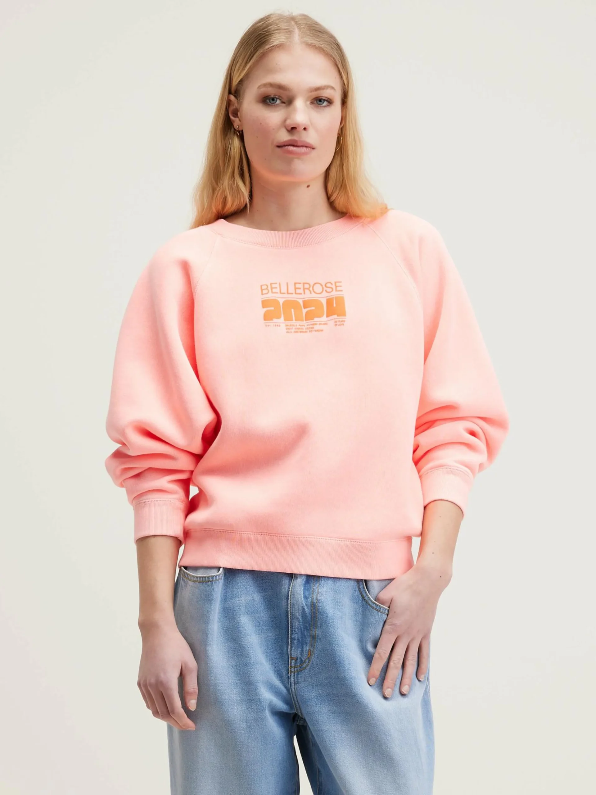 Relaxed flashy zacht roze sweatshirt met Bellerose 2024-print vooraan.