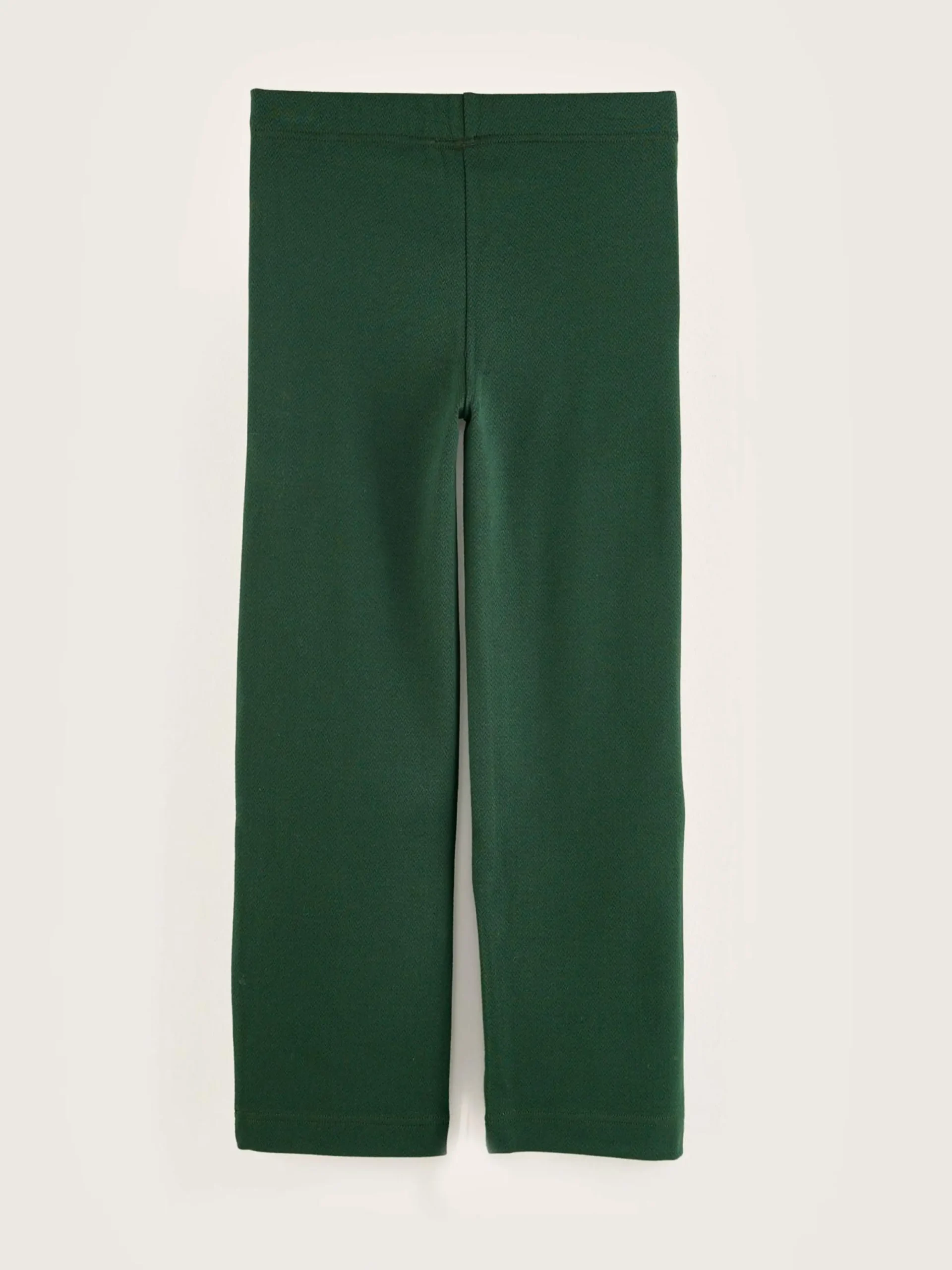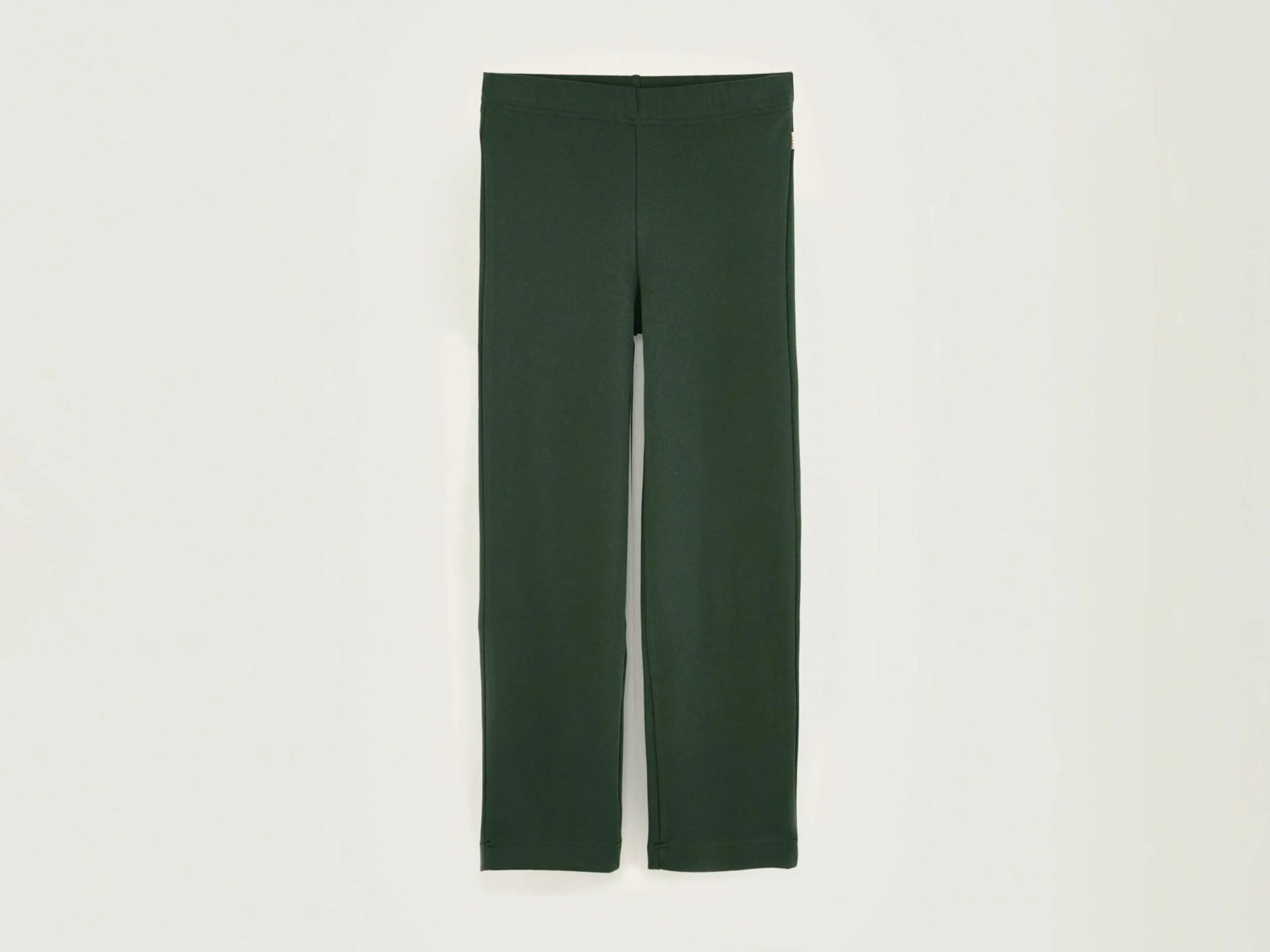 Flesgroene broek met flared pijpen en elastische tailleband.