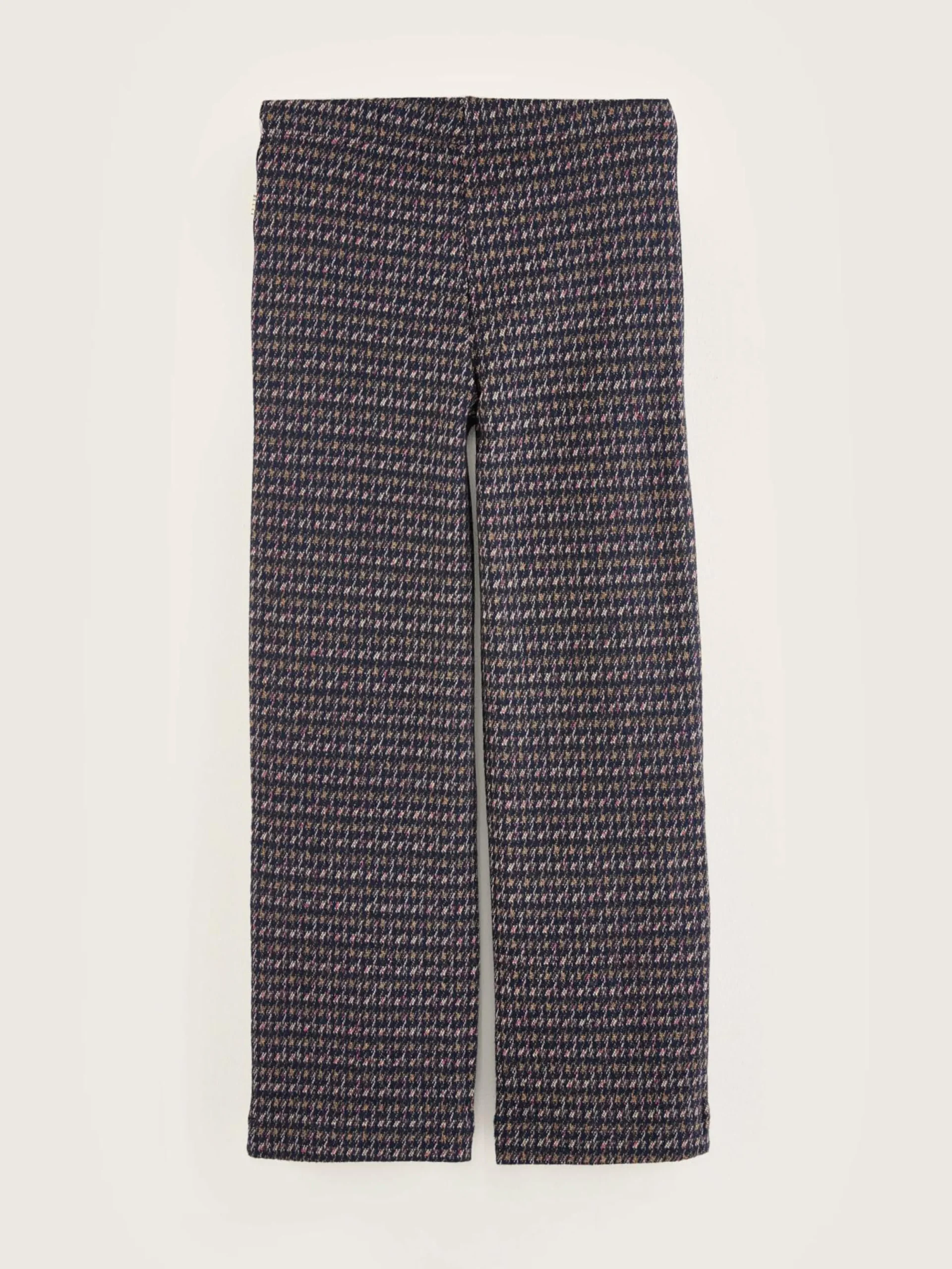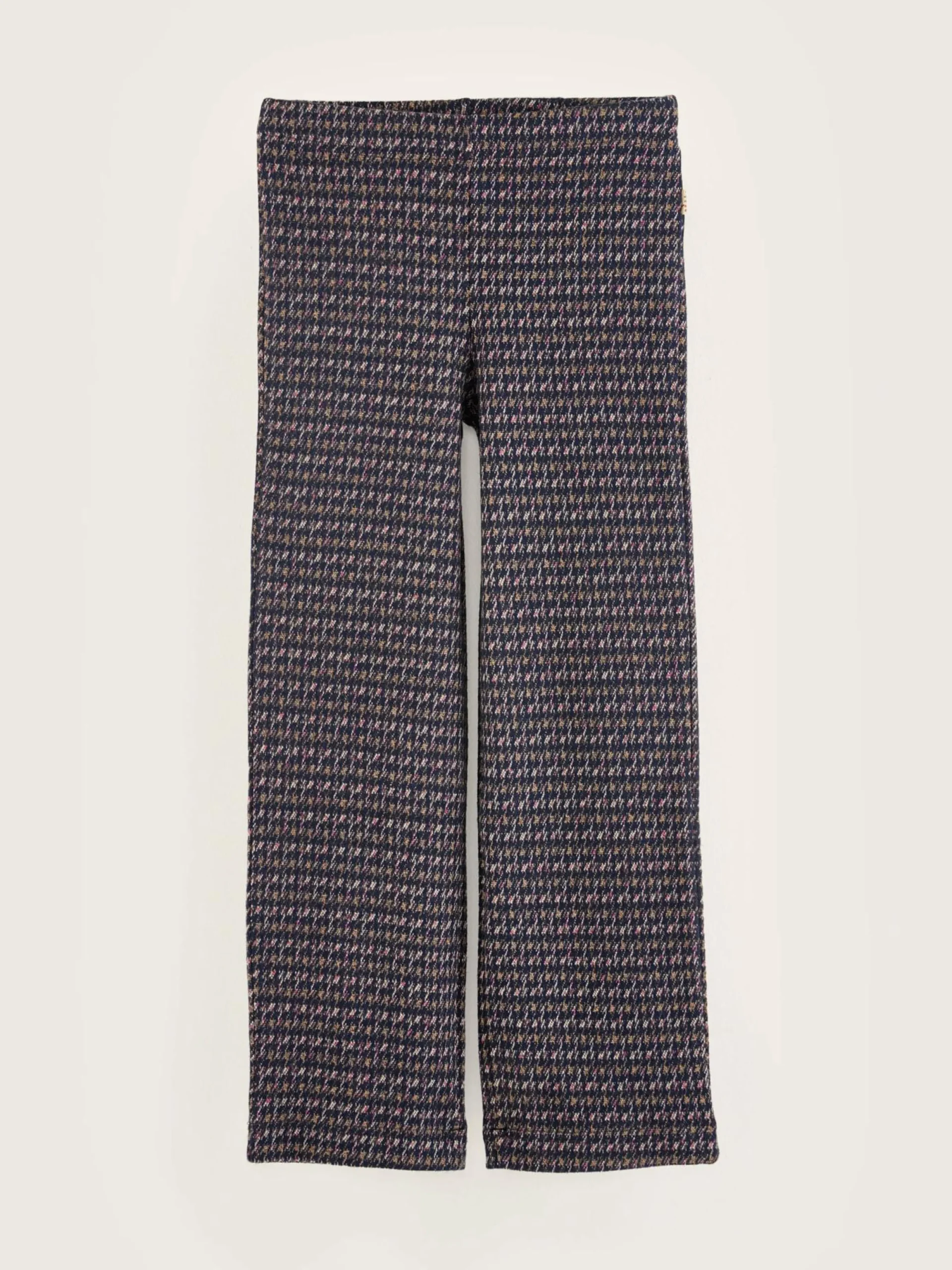Flesgroene broek met flared pijpen en elastische tailleband.