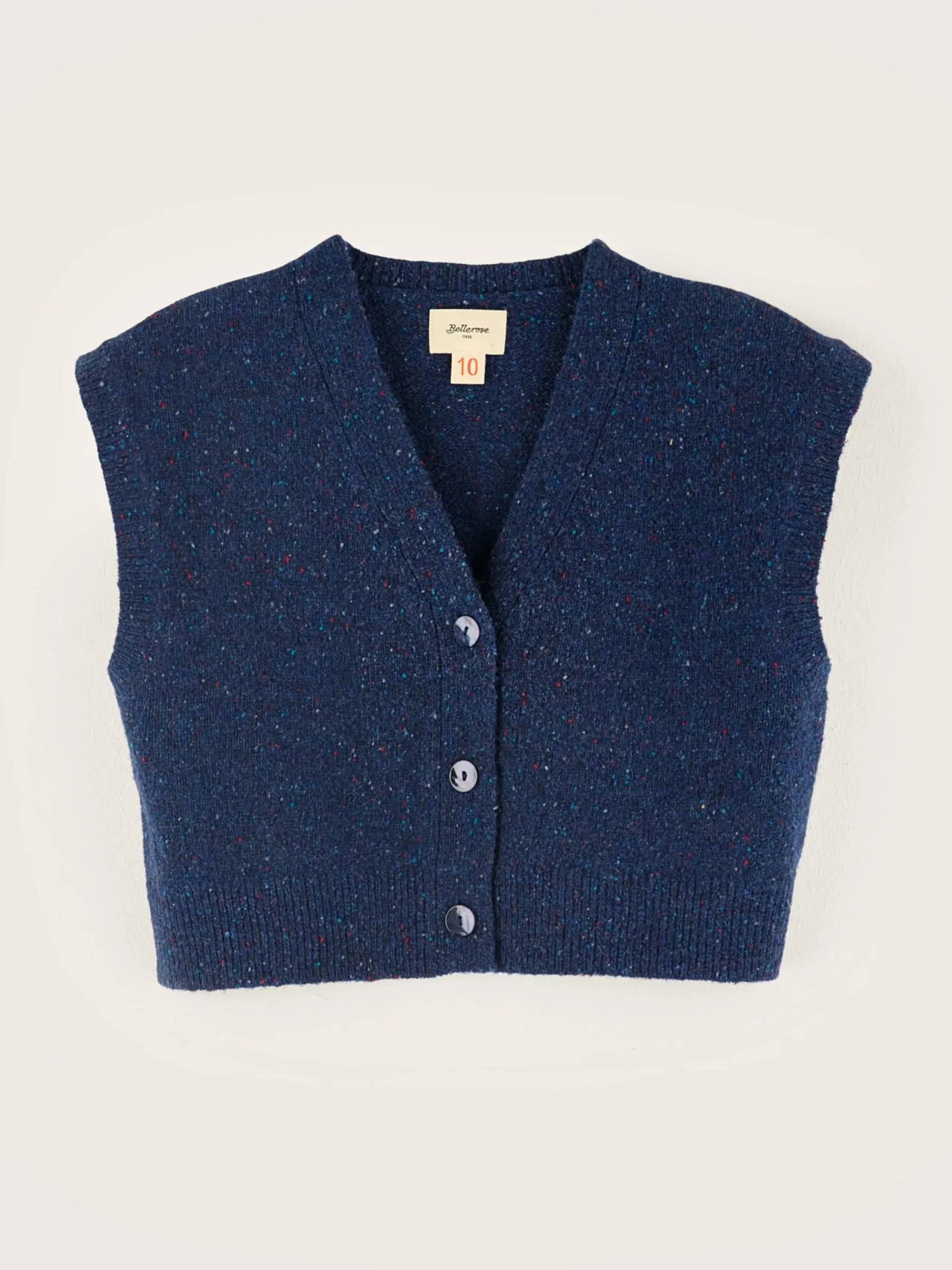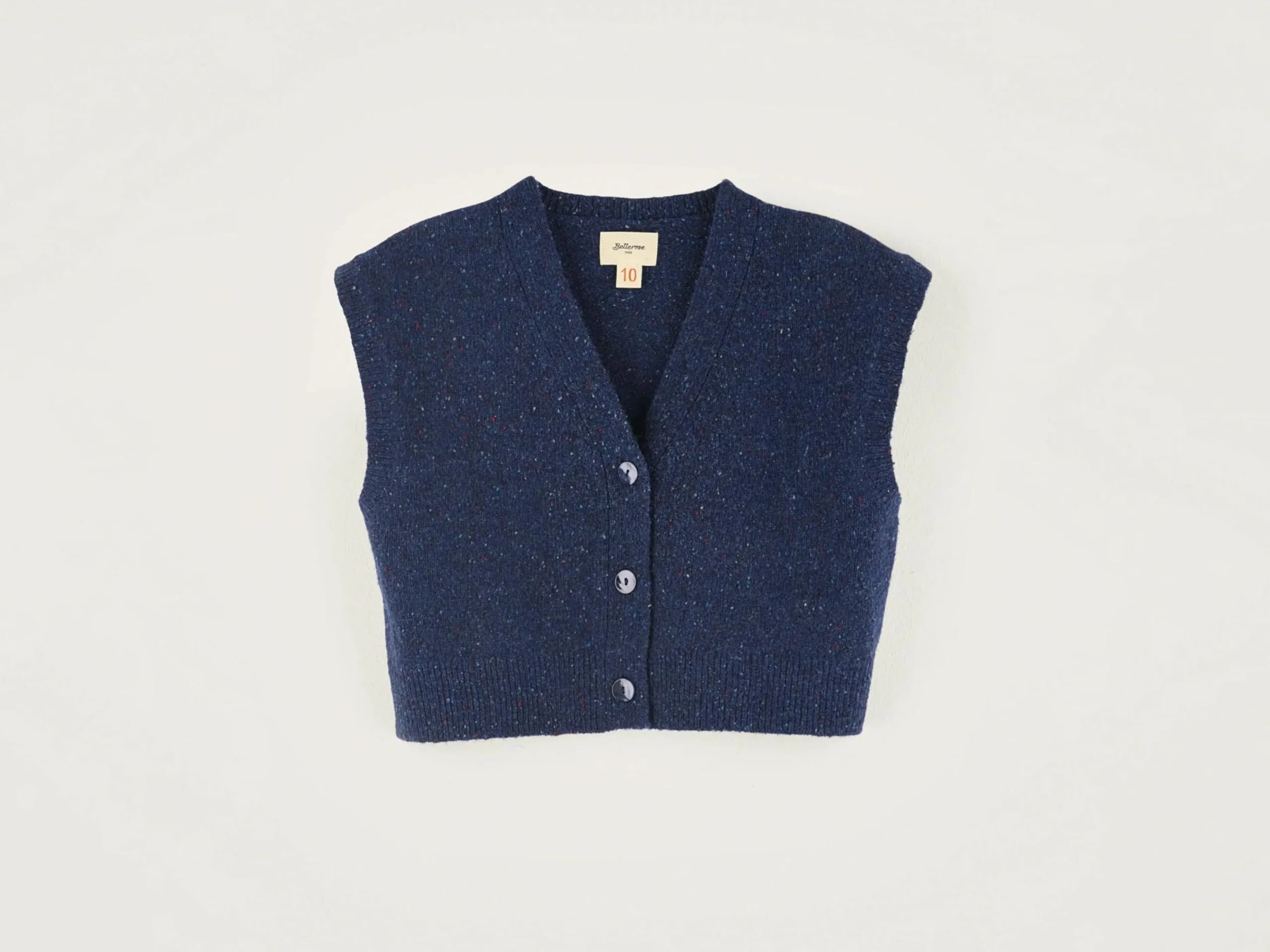 Donkerblauw, mouwloos, cropped en gebreid vest.