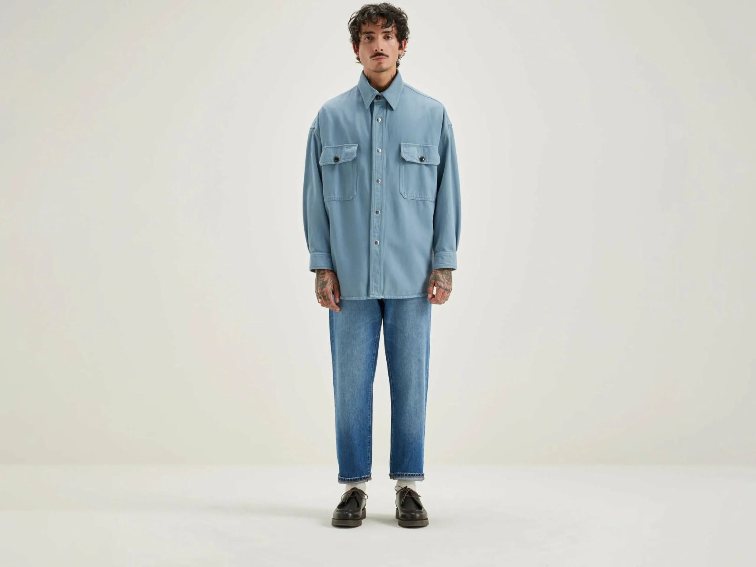 Oversized overshirt met opgestikte zak, van Chambray-blauw katoen.