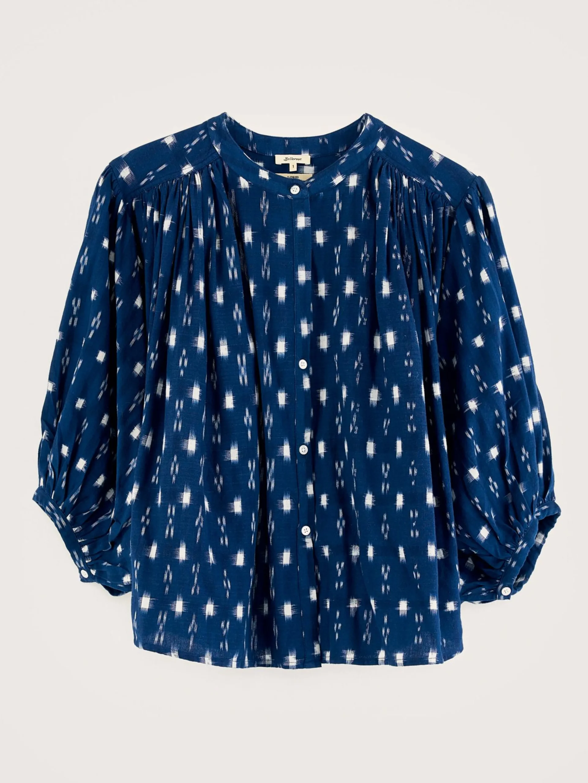 Oversizede cropped blouse van blauw Ikat katoen, met gefronste details.