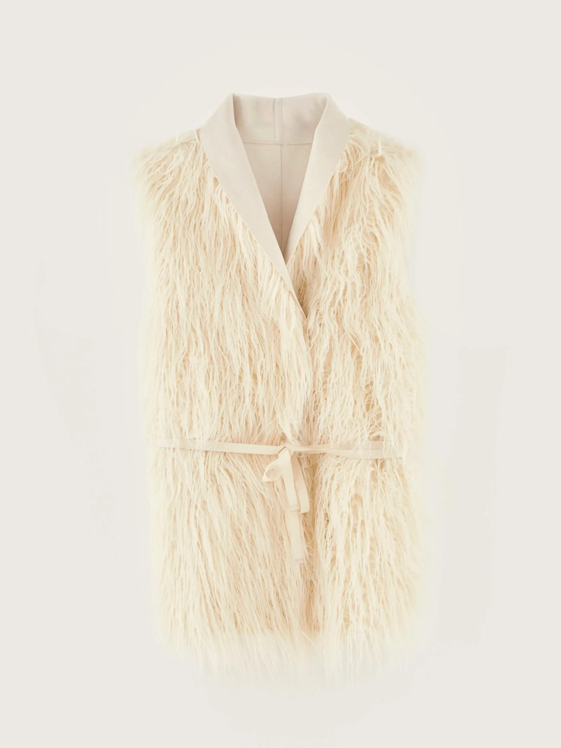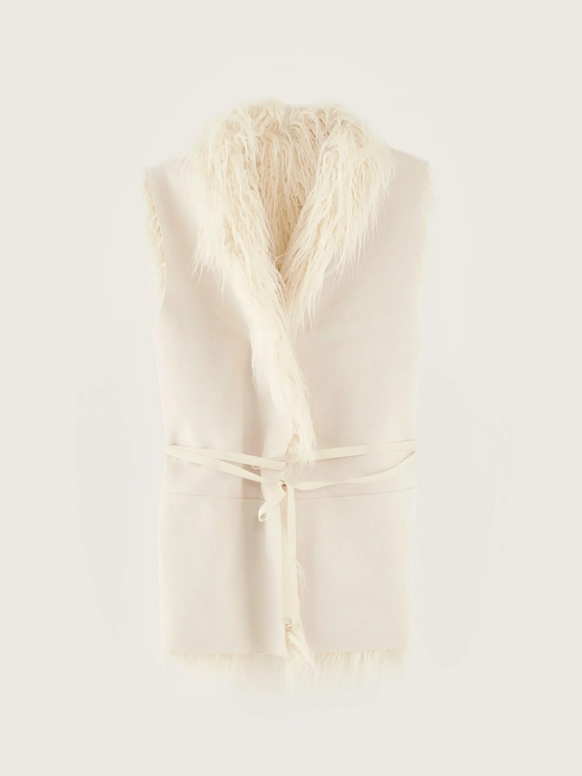 Omkeerbaar, mouwloos vest met zelfbindende riem, van ecru nepbont met imitatiesuède rug.