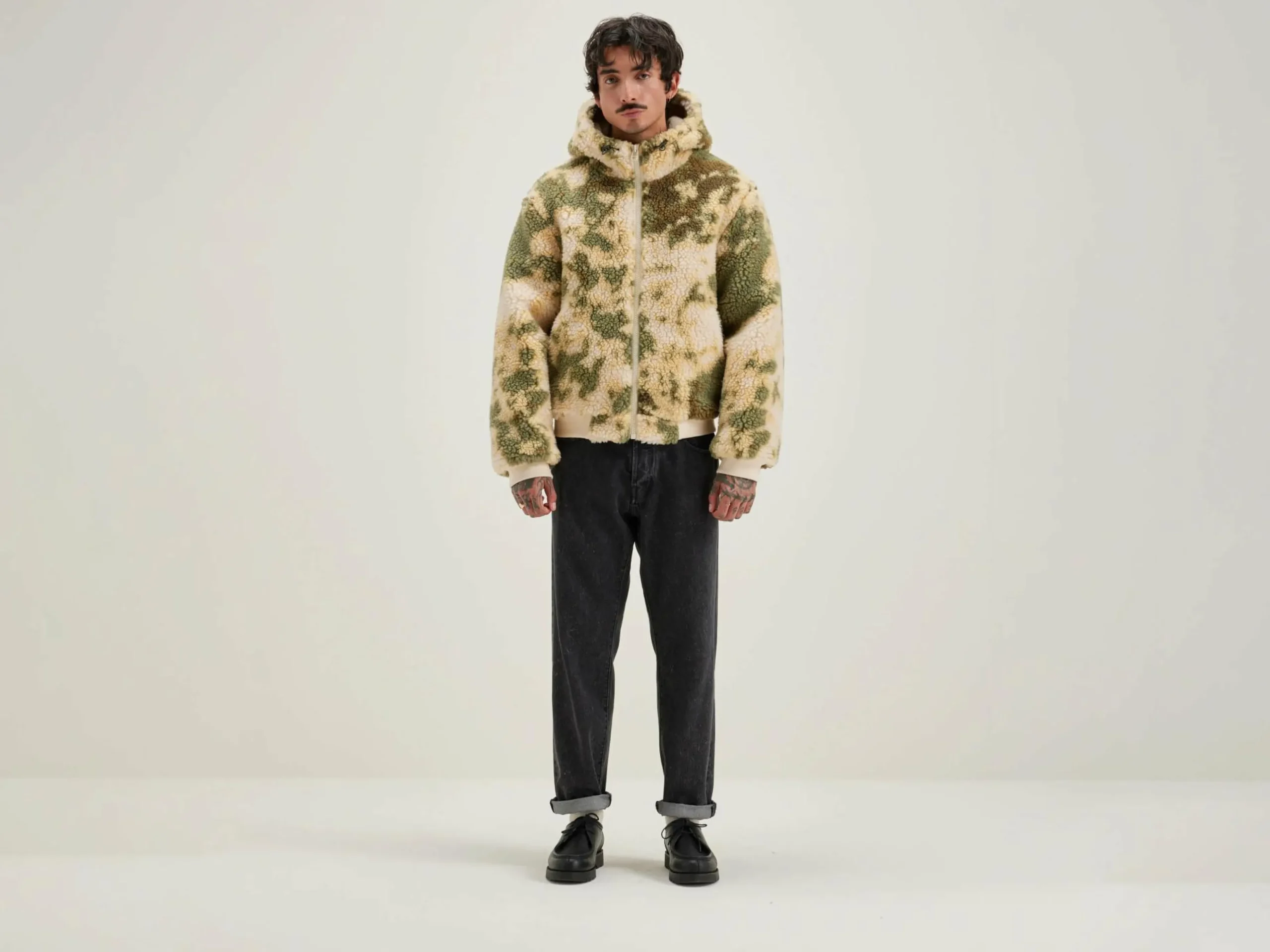 Klassieke hoodie met ritssluiting vooraan, in teddy met camouflageprint.