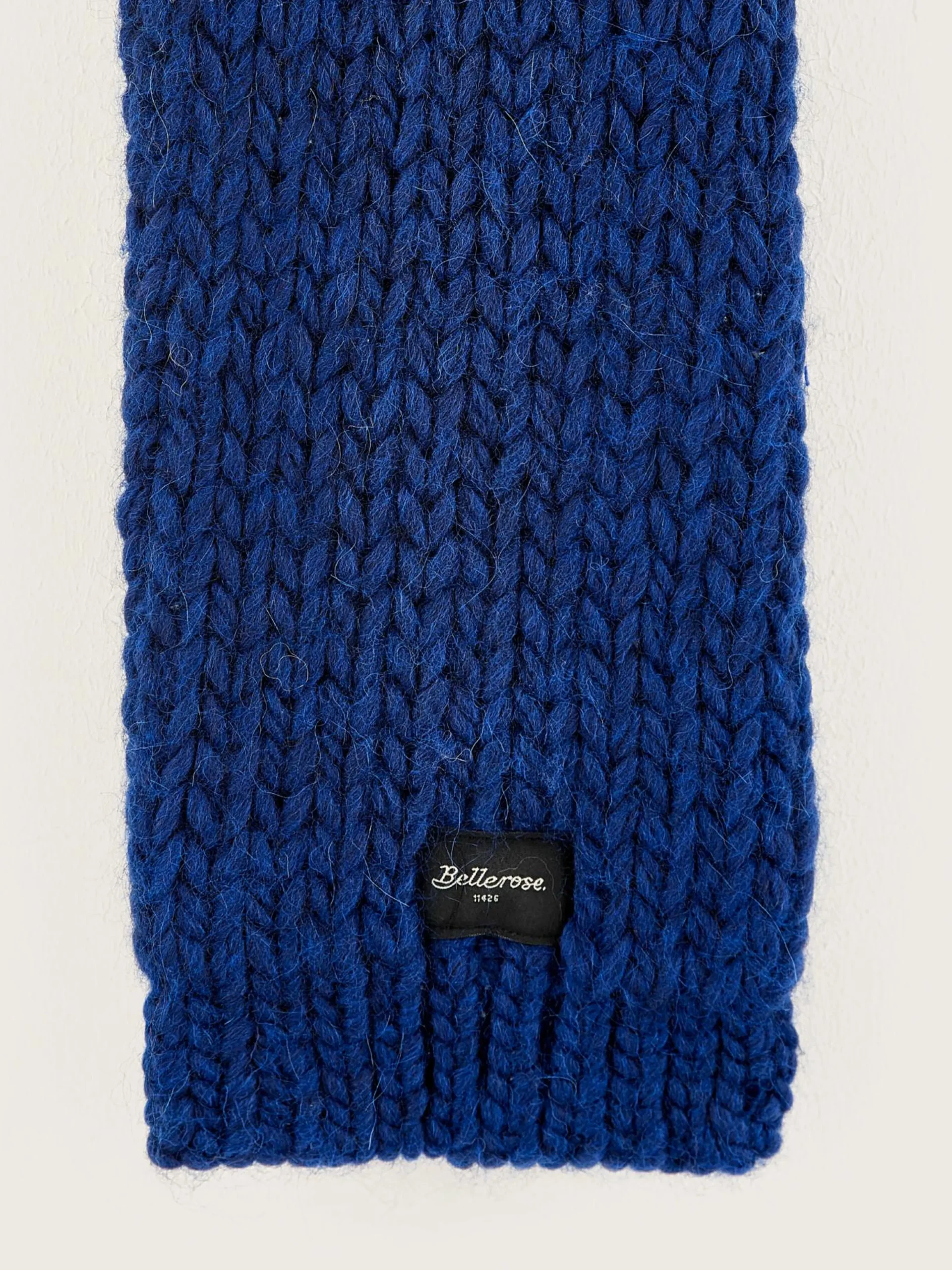 Kobaltblauwe, jersey gebreide sjaal met dik garen.