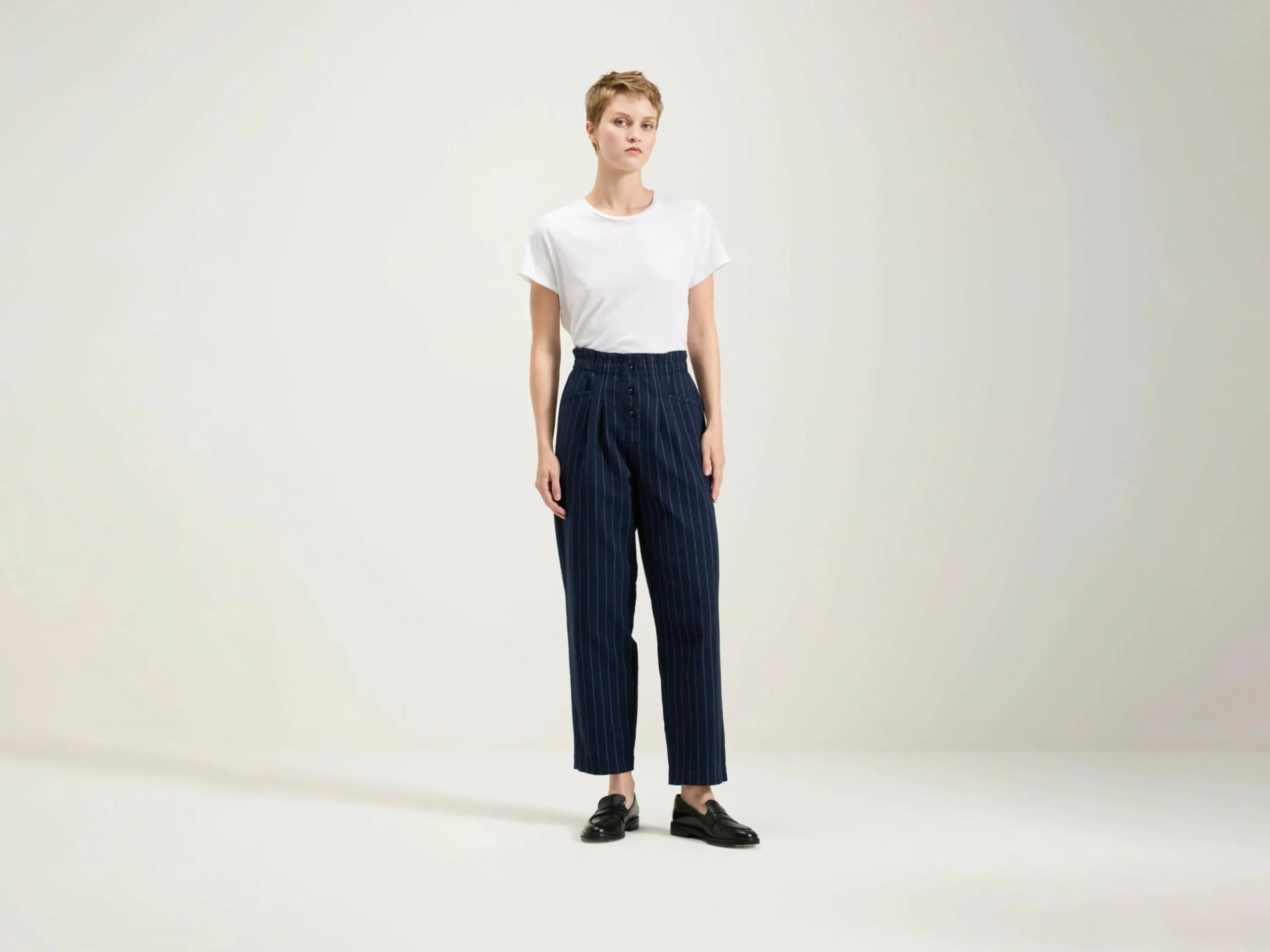 Paperbag-stijl broek van krijtstreepstof met kleine zakken en knopen aan de voorkant, in marineblauw.