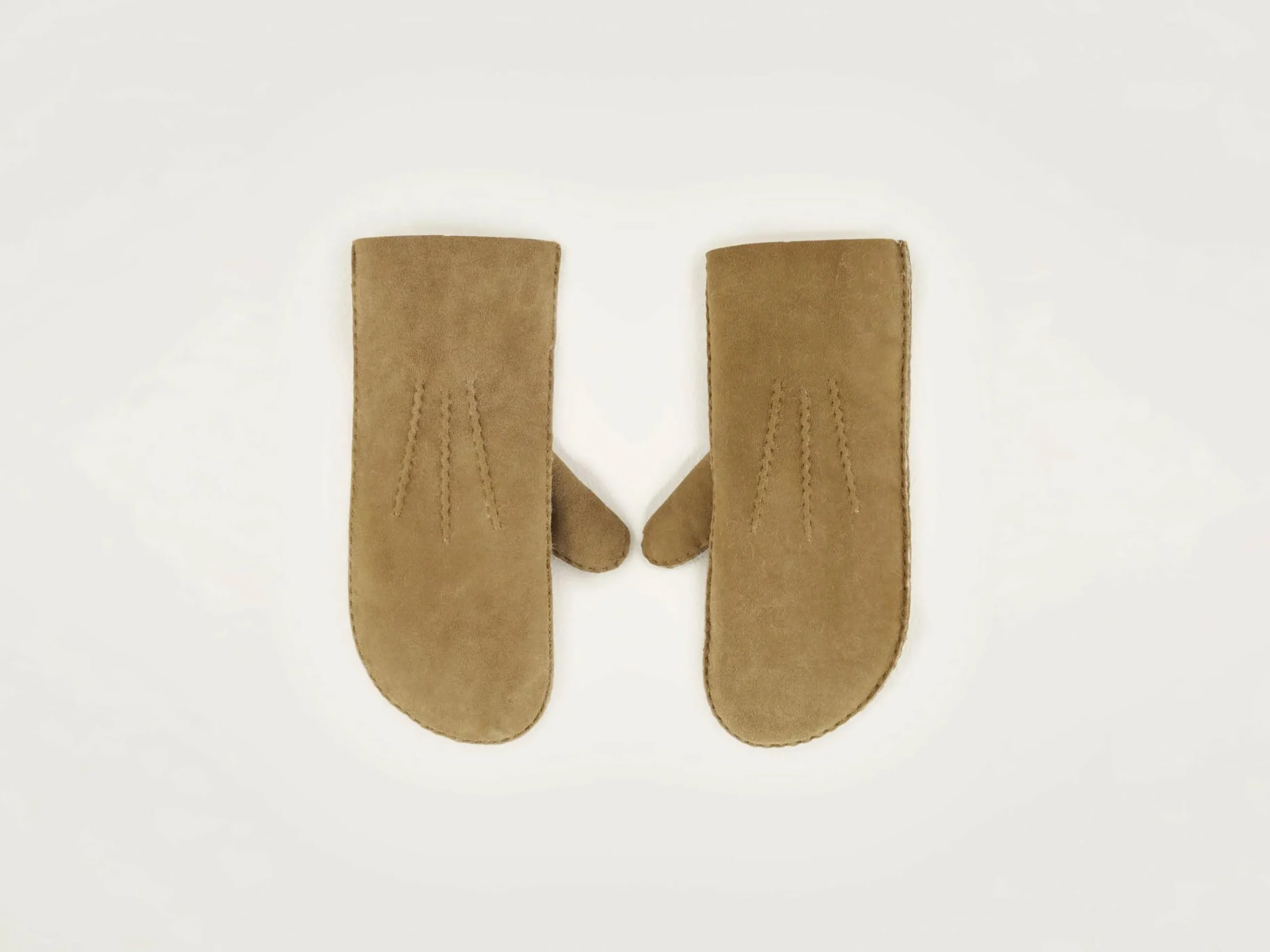 Klassieke wanten van cognac-kleurige shearling, met de leren kant vanbuiten en de wollige kant naar binnen gekeerd.