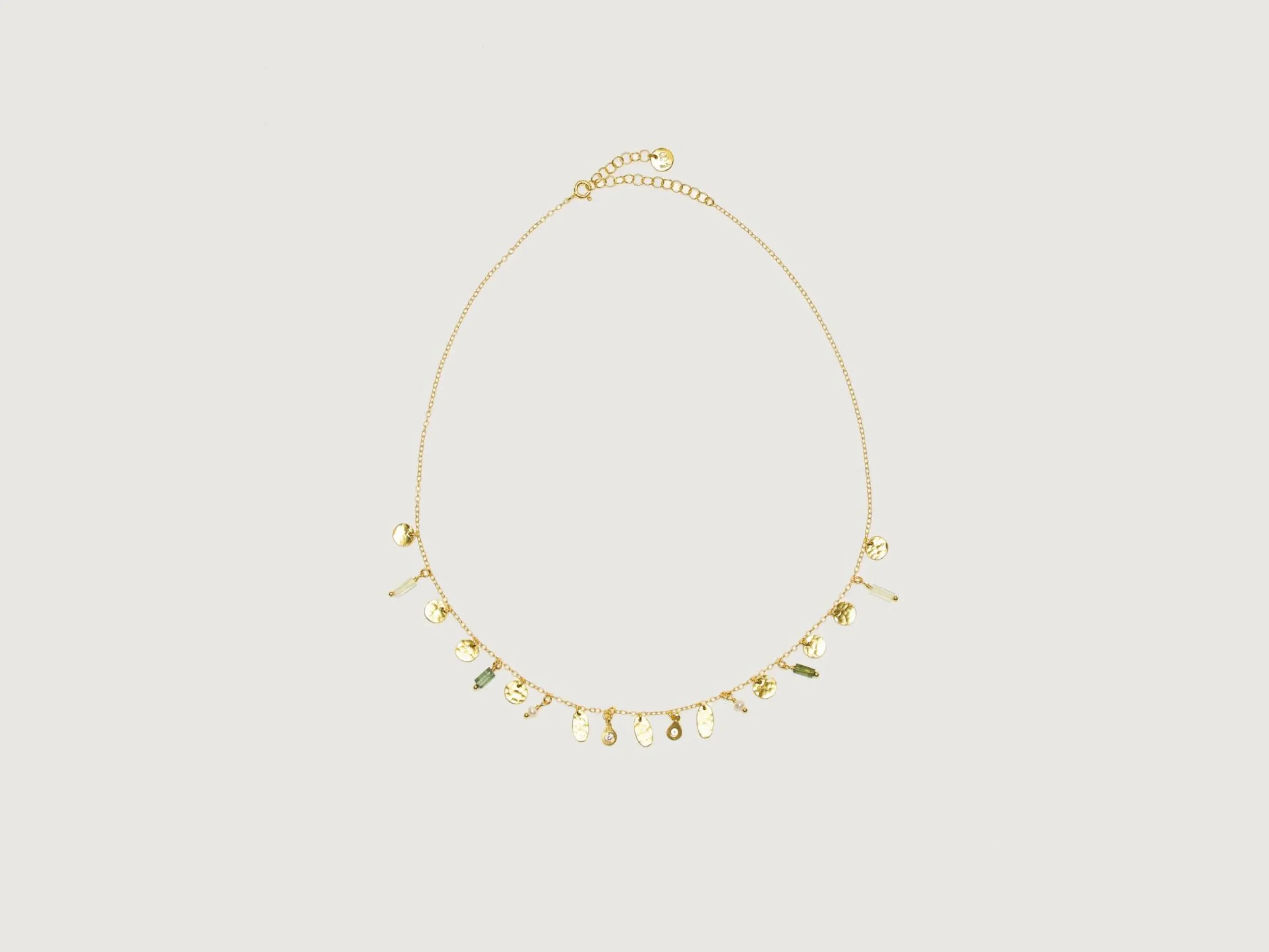 The Mary Gaitani Tourmaline necklace is handmade in Greece with tourmaline stones, pearls, and 18k gold-plated charms.