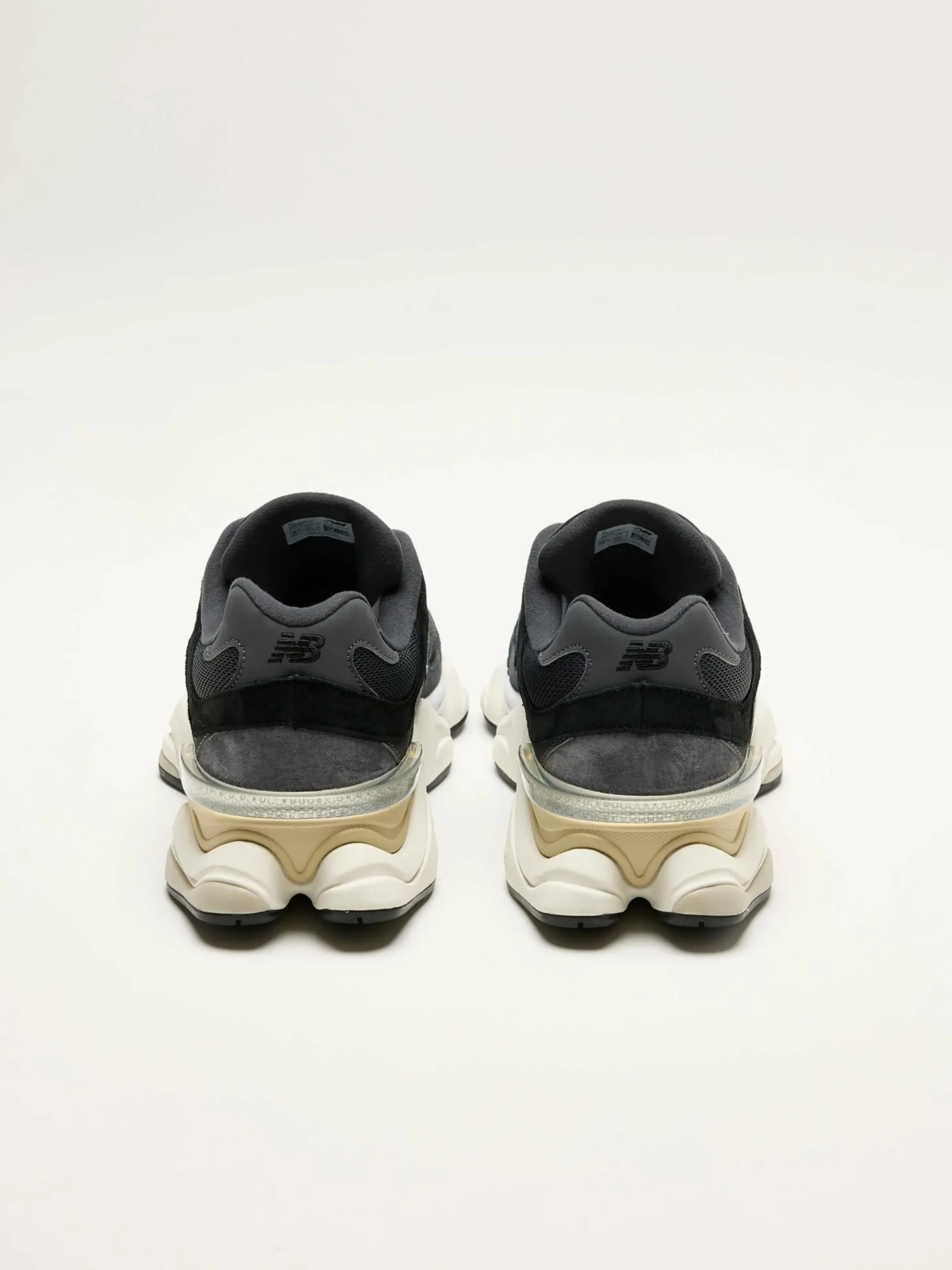 De New Balance 9060 sneakers hebben een technisch bovenwerk van leder, suède en mesh, een dempende middenzool en een buitenzool met een diamanten patroon..