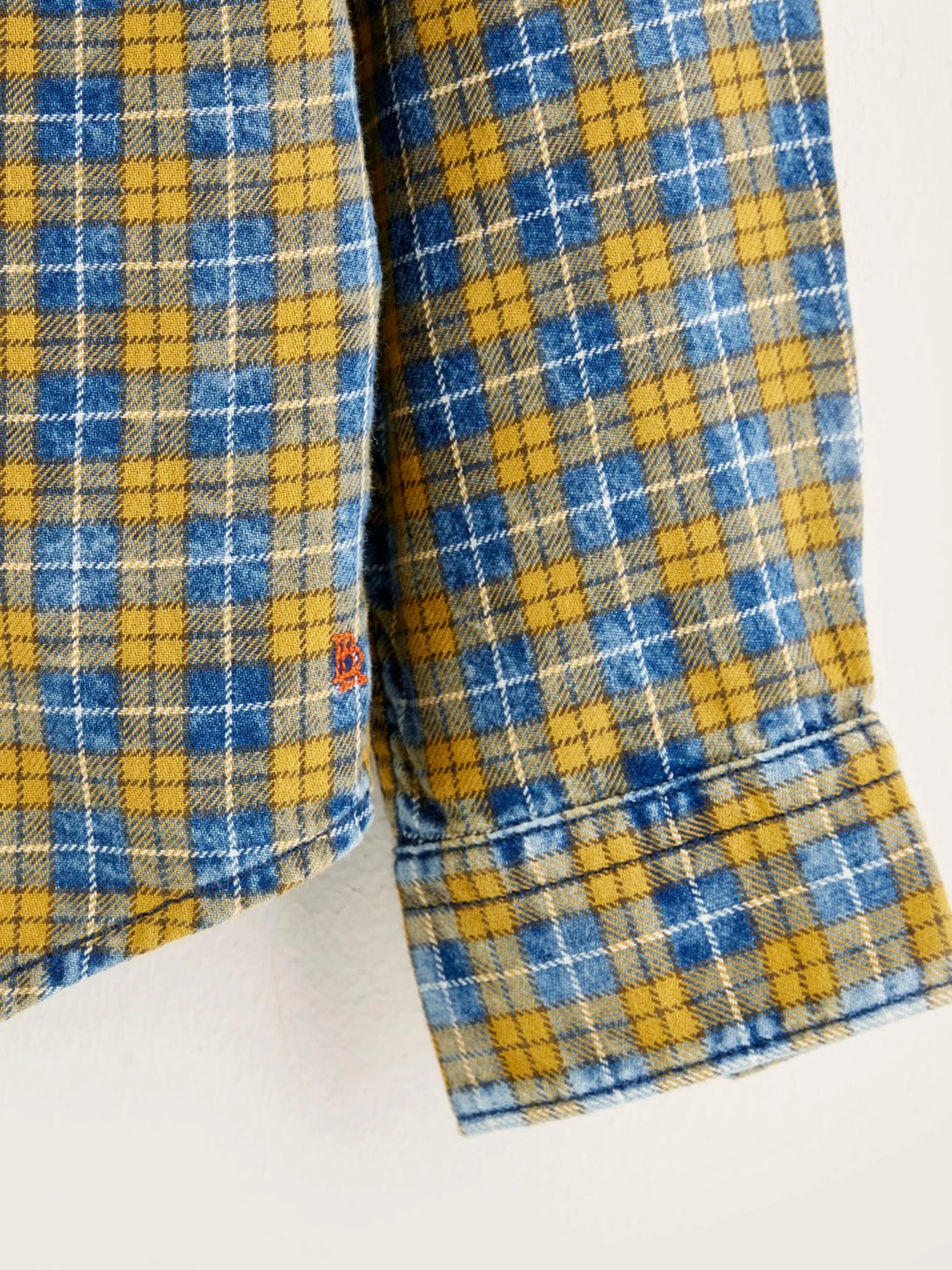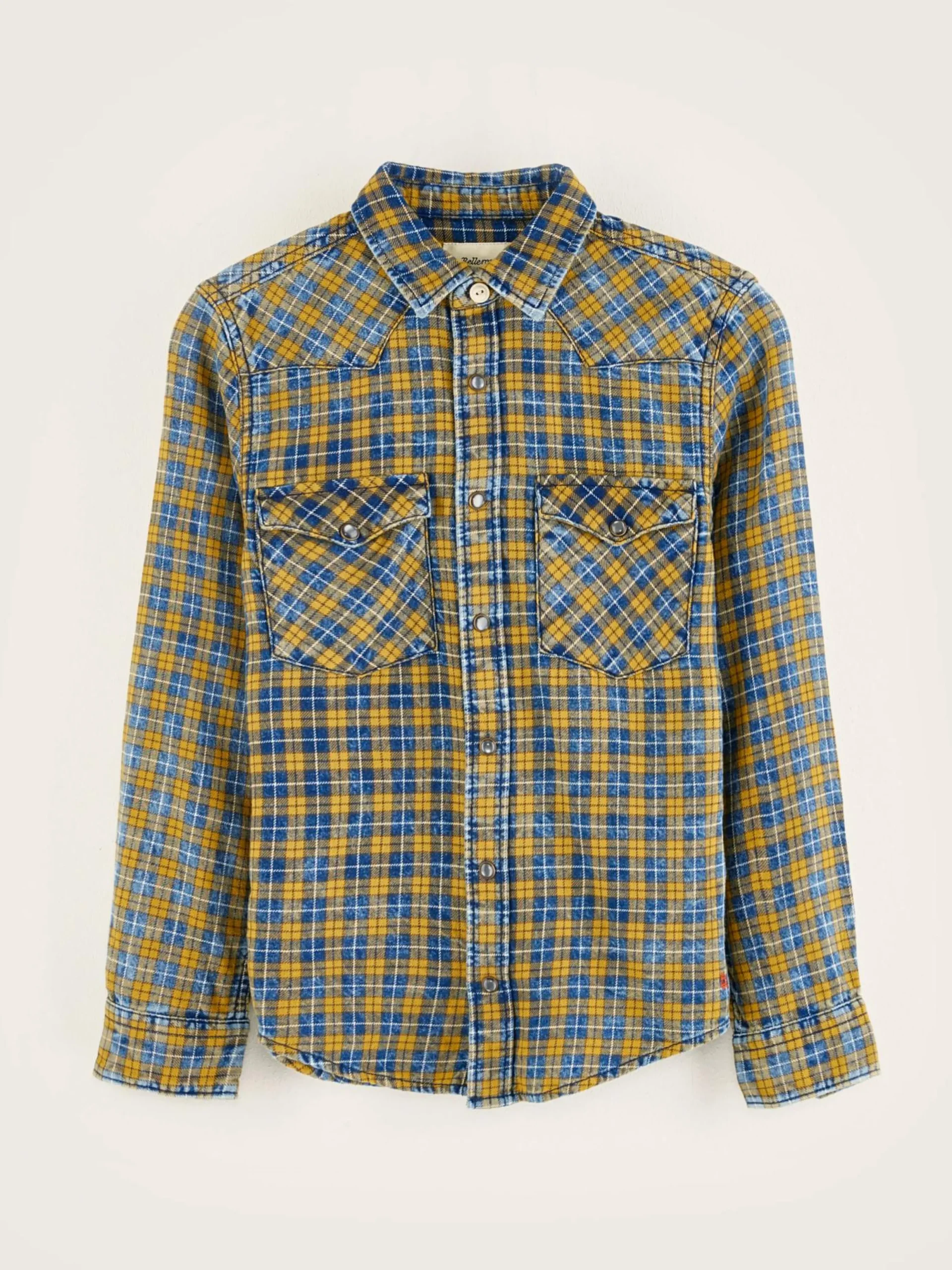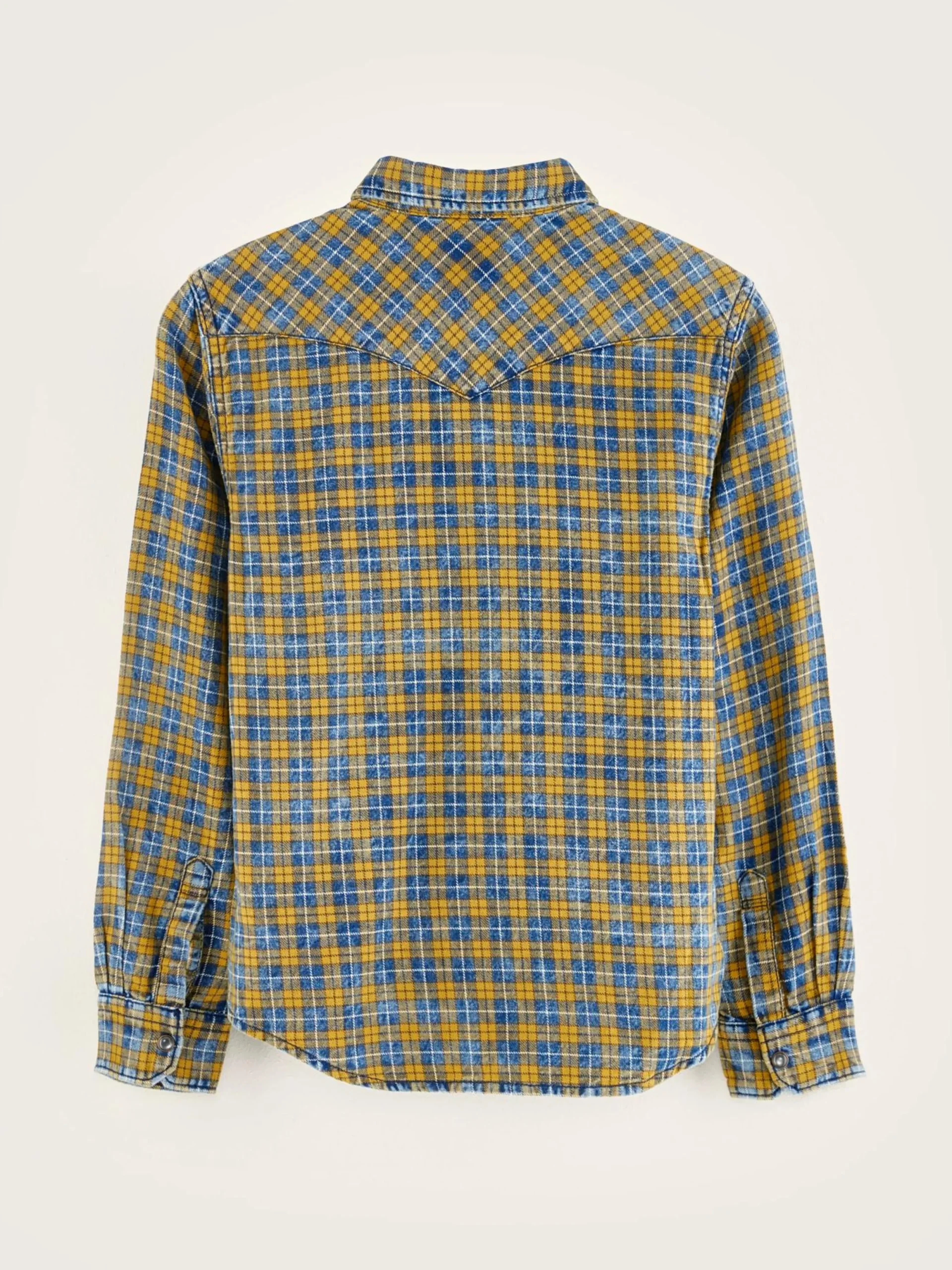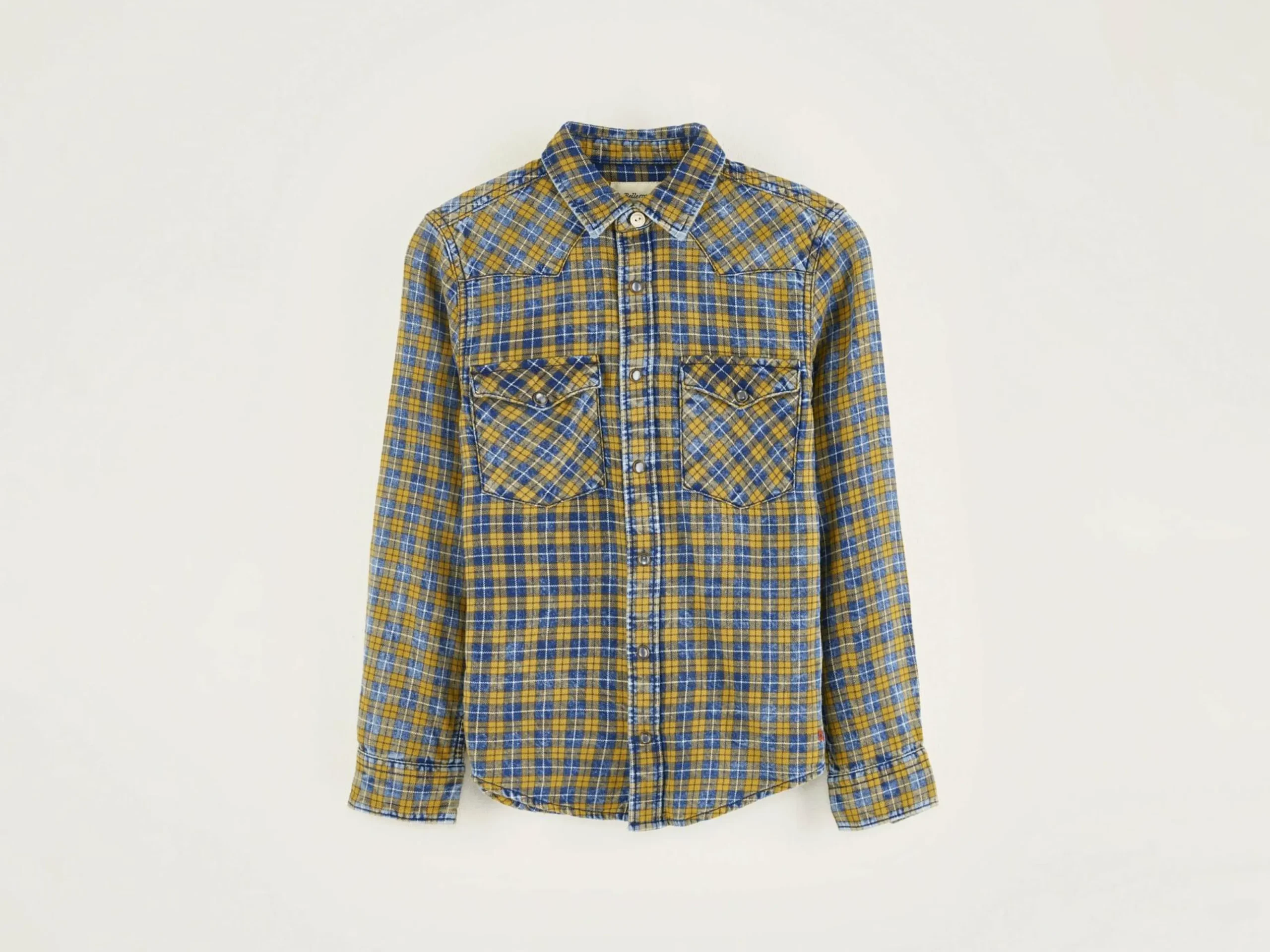 Hemd in westernstijl van gewassen indigo-geruit katoen, met paarlemoer drukknopen en zakken vooraan.