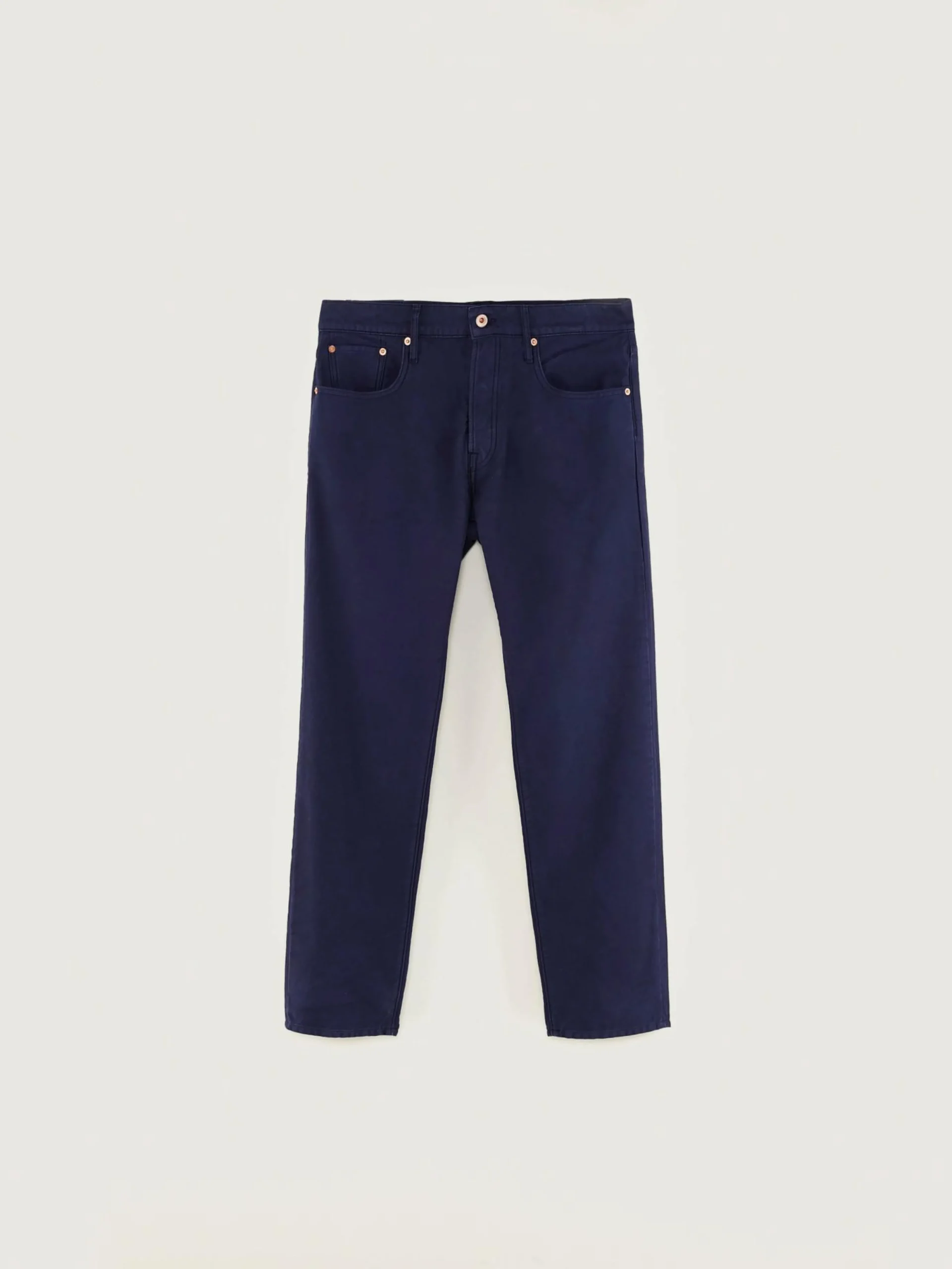 “Dad-style” broek met lage taille en rechte pijpen, in five-pocket uitvoering, van inktblauwe katoen.