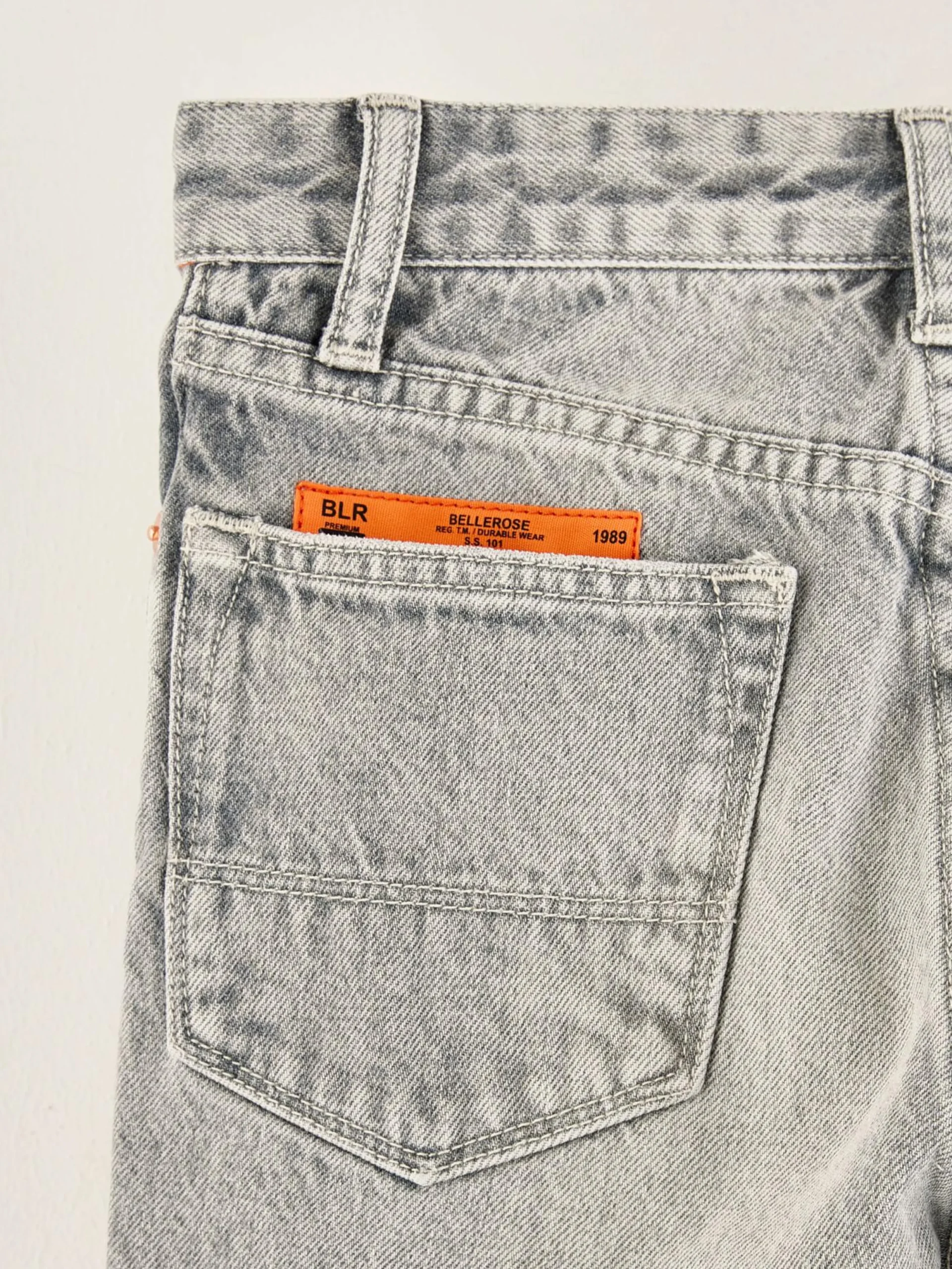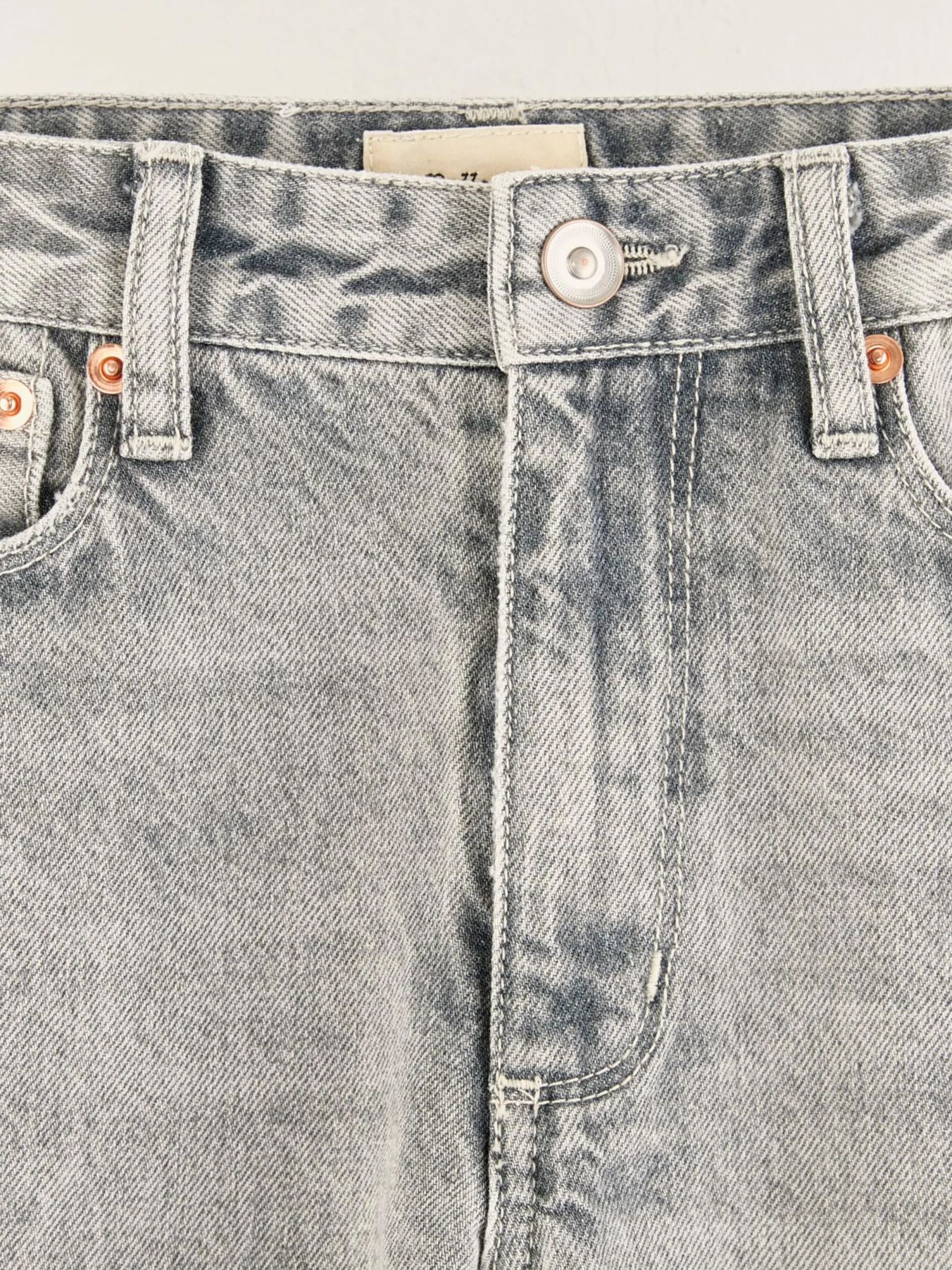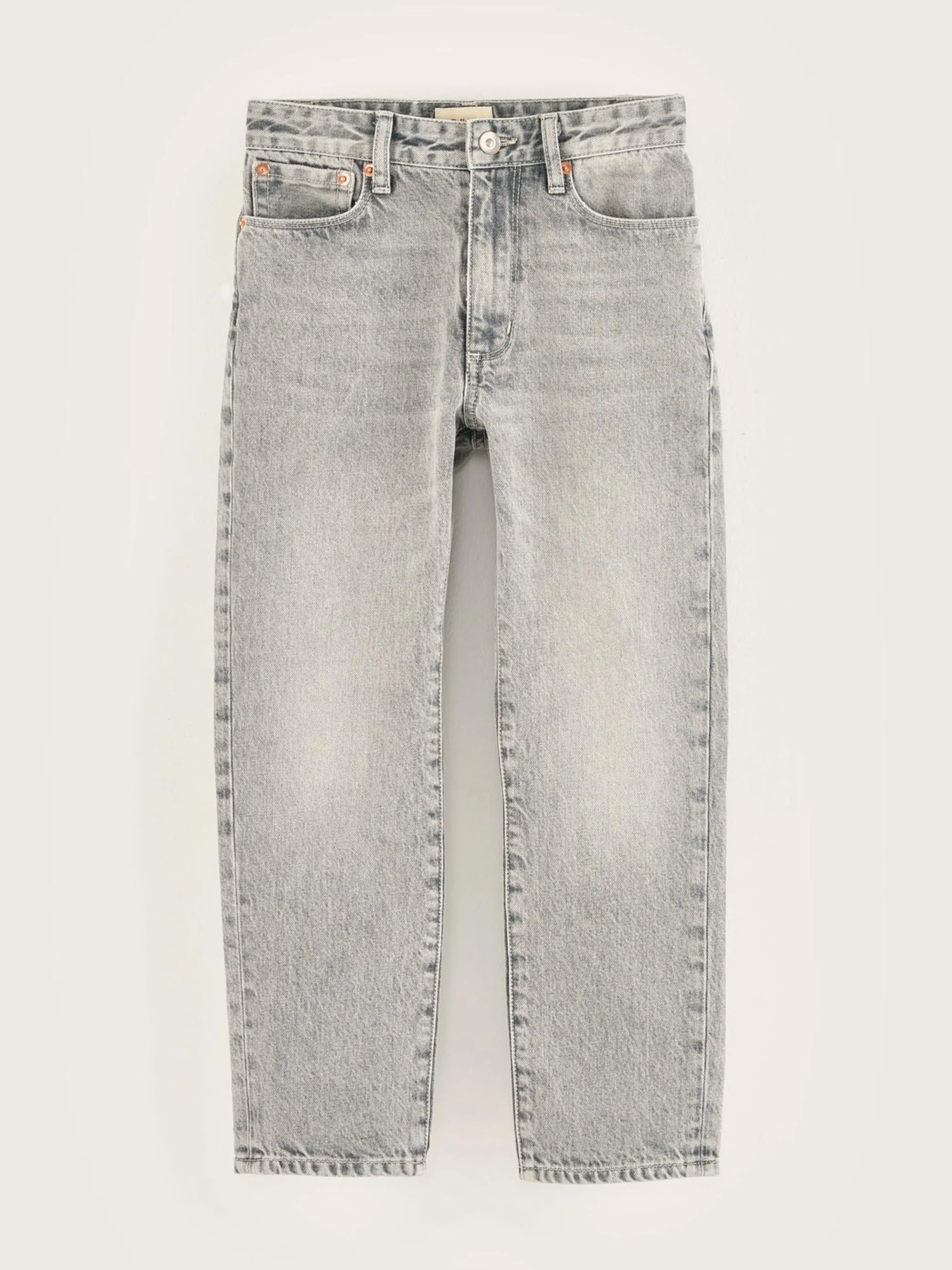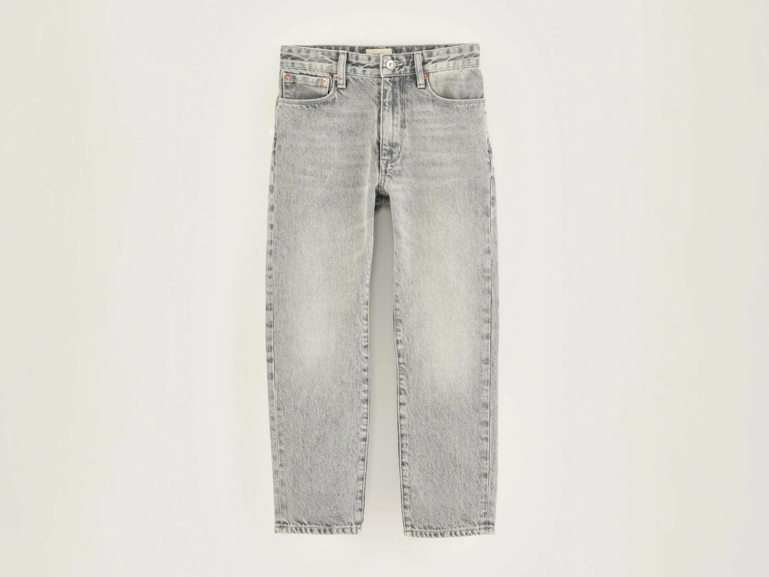 Klassieke jeans met hogere taille en taps toelopende pijpen, van grijs stonewashed katoendenim.