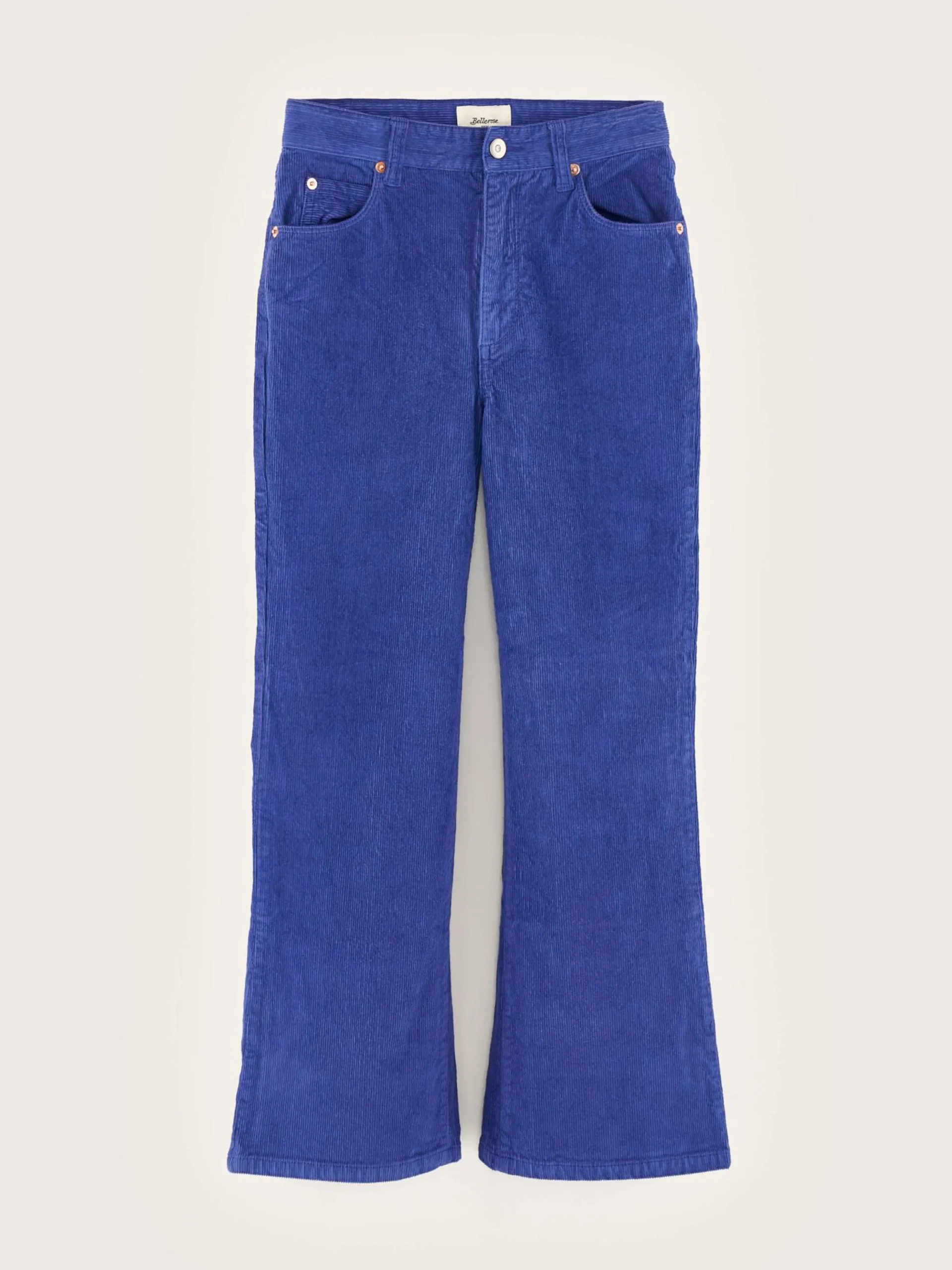 Blauwe broek met hoge taille en flared pijpen, van baby corduroy.