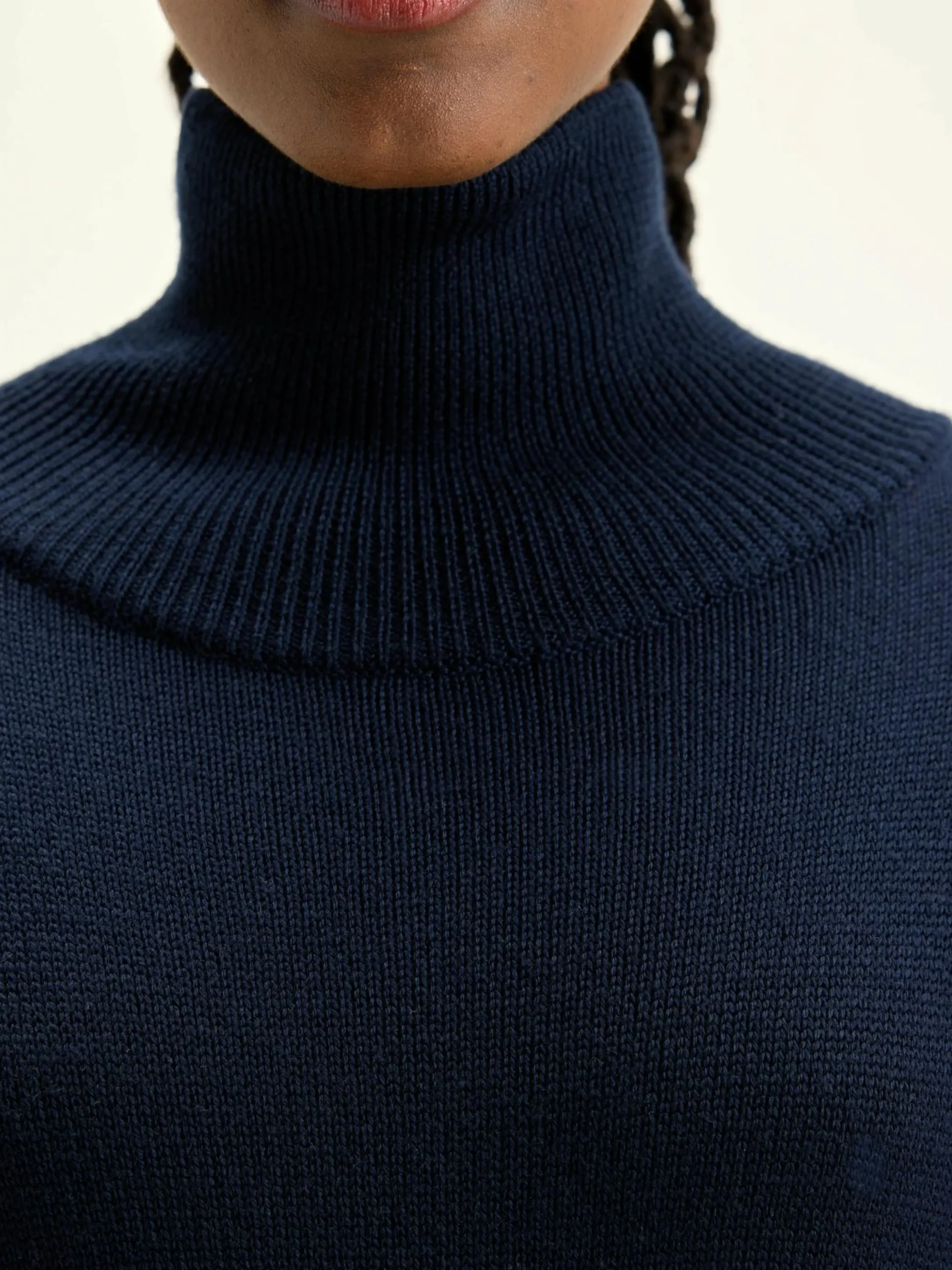 Marineblauwe, oversizede gebreide jurk van extra fijne merino, met een dubbelgebreide turtle neck.