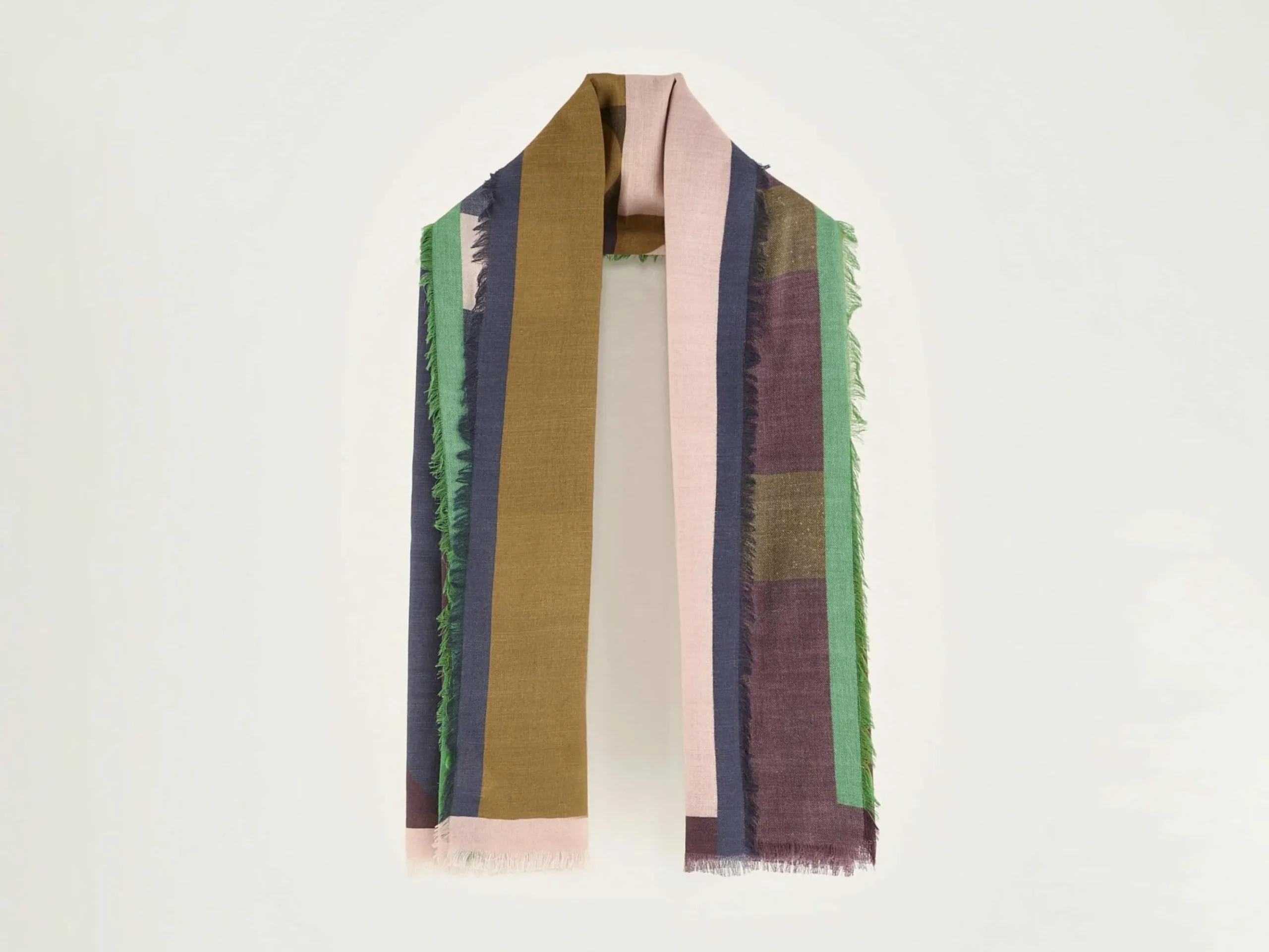 Vierkante sjaal met logo in veelkleurige letters op een gespikkelde achtergrond.