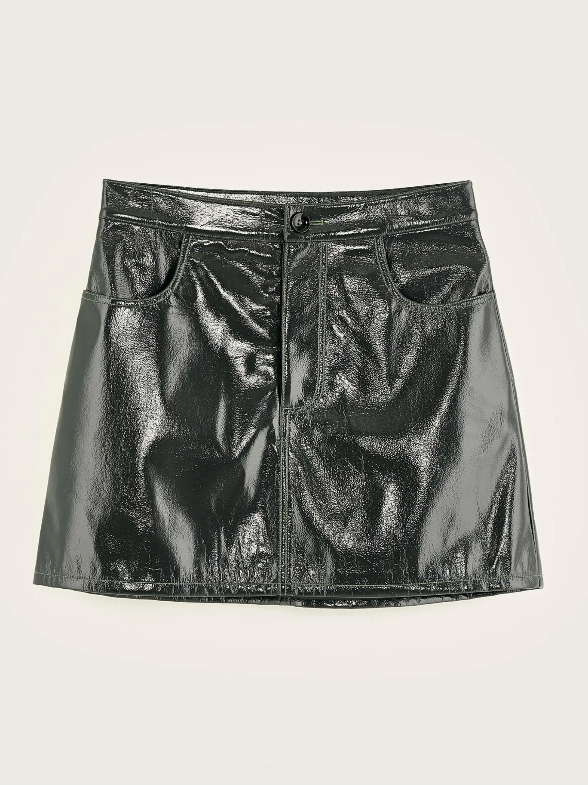 Grijs, trapeziumvormige minirok in five-pocketstijl, van imitatieleer.