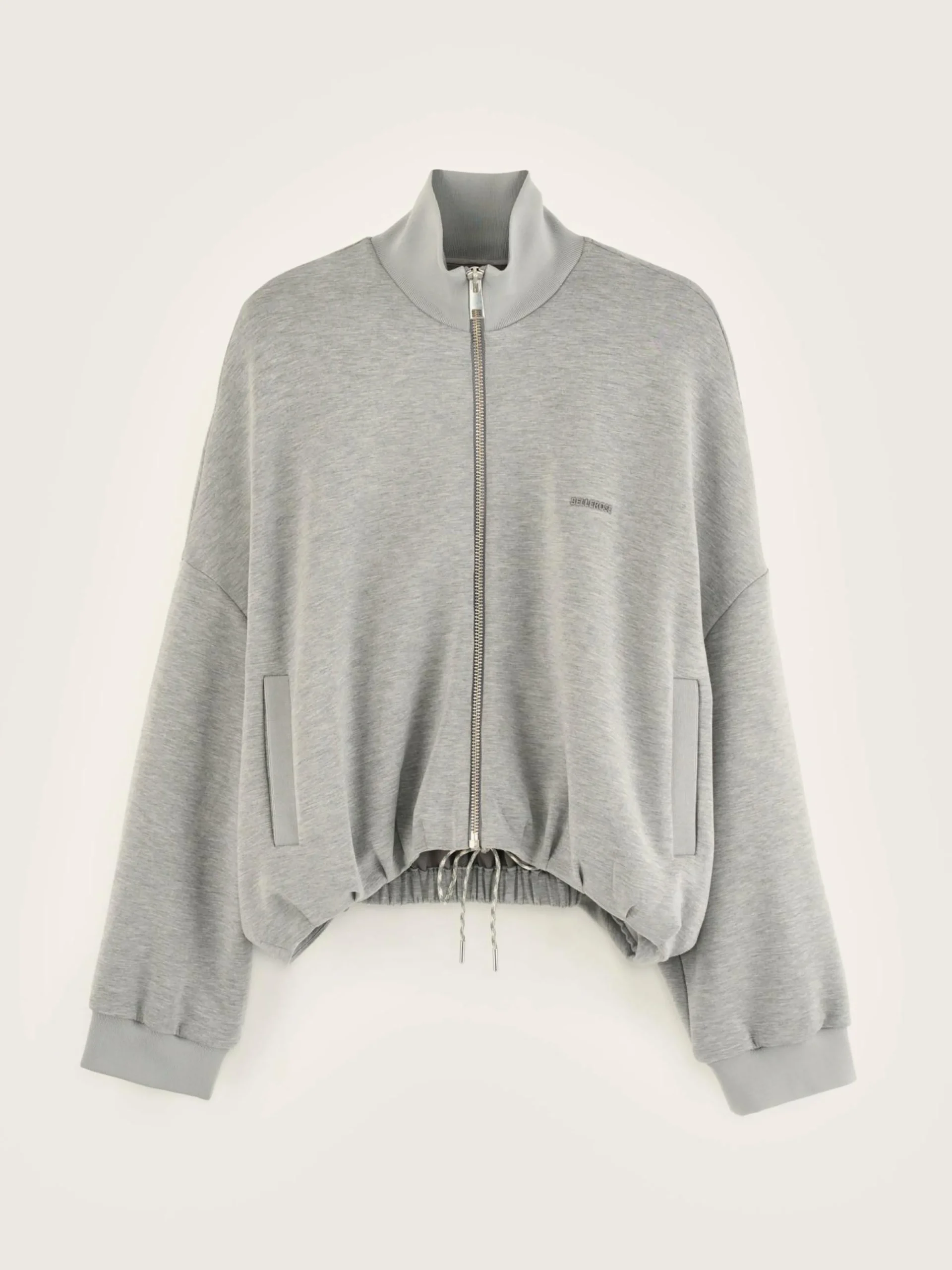 Grijs gemêleerd sweatshirt met ritssluiting vooraan, met opstaande kraag en elastische zoom, van neopreenachtige jersey.