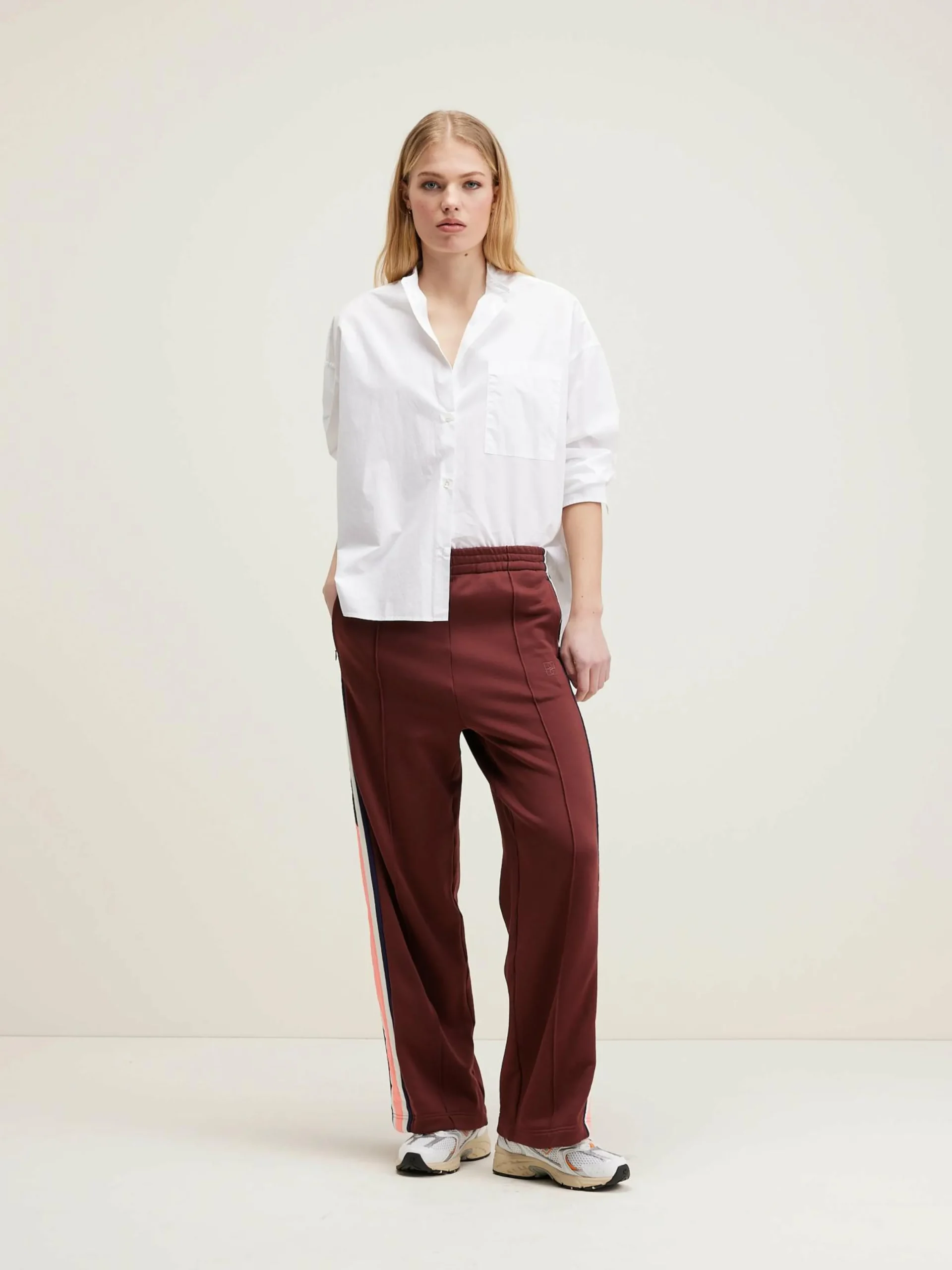 High-waist, granaatappelrode joggingbroek met contrasterende zijstrepen.