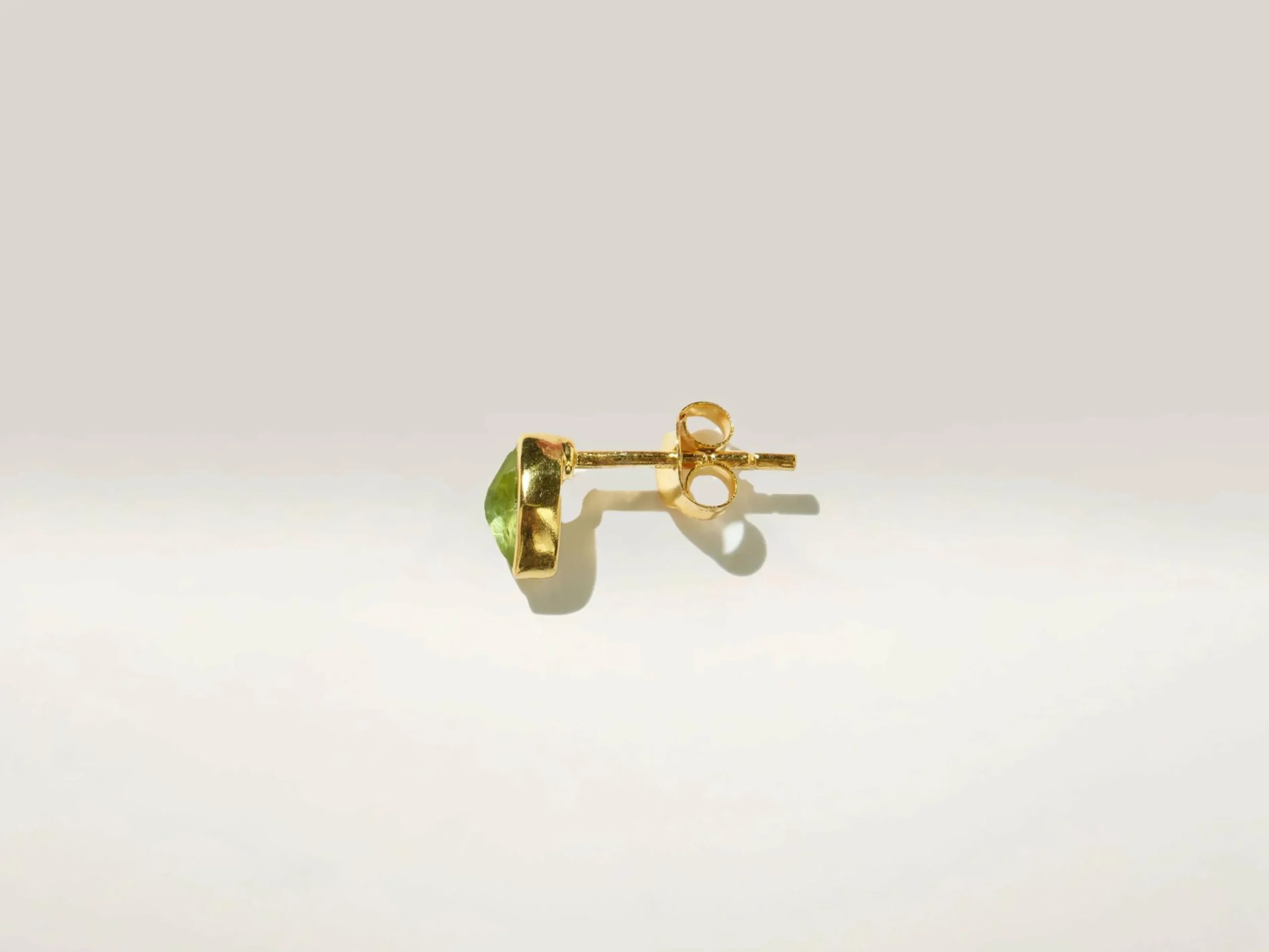 The Pandore stud earring is a soft green chalcedony gemstone set in gold-plated silver.