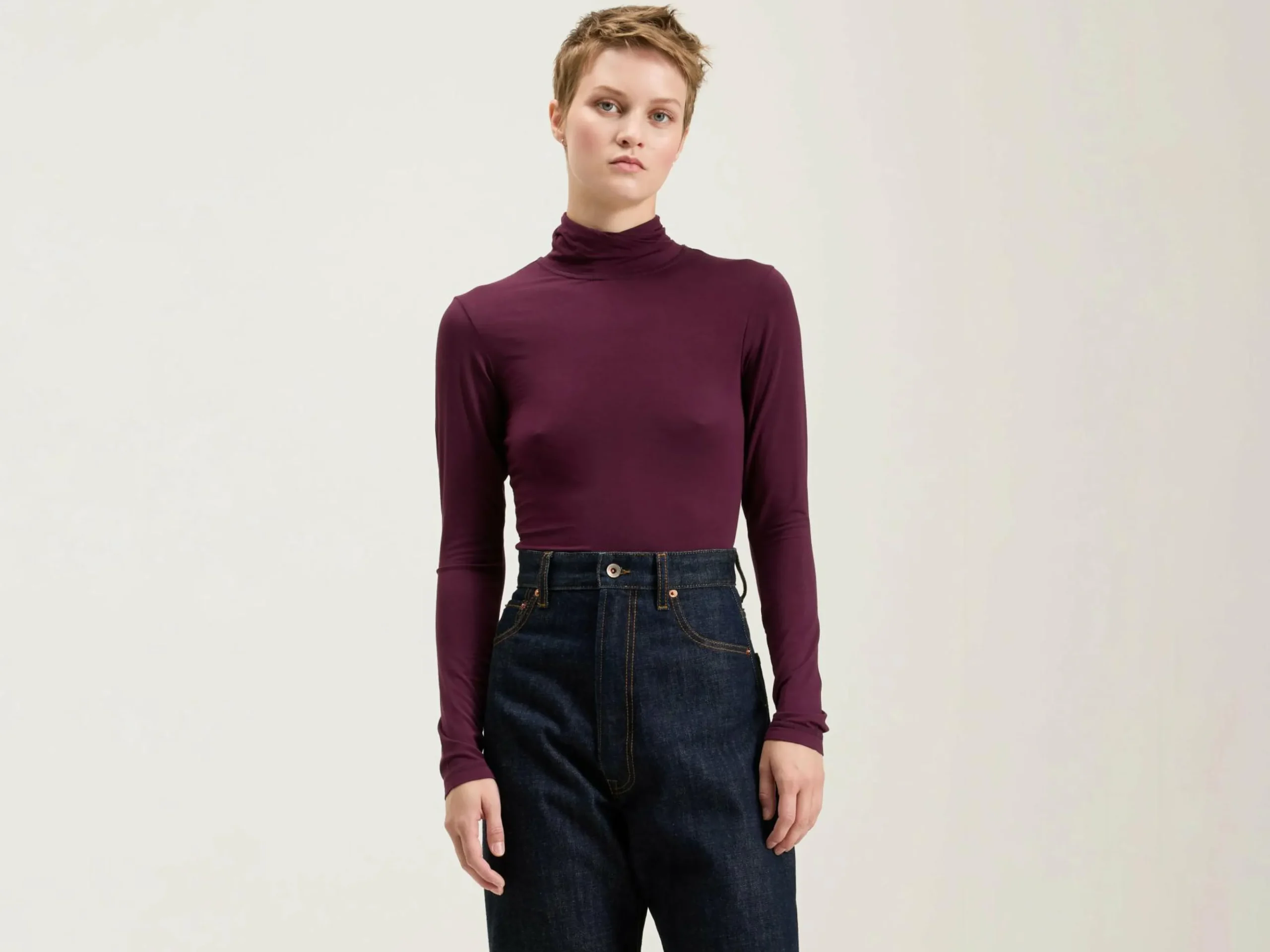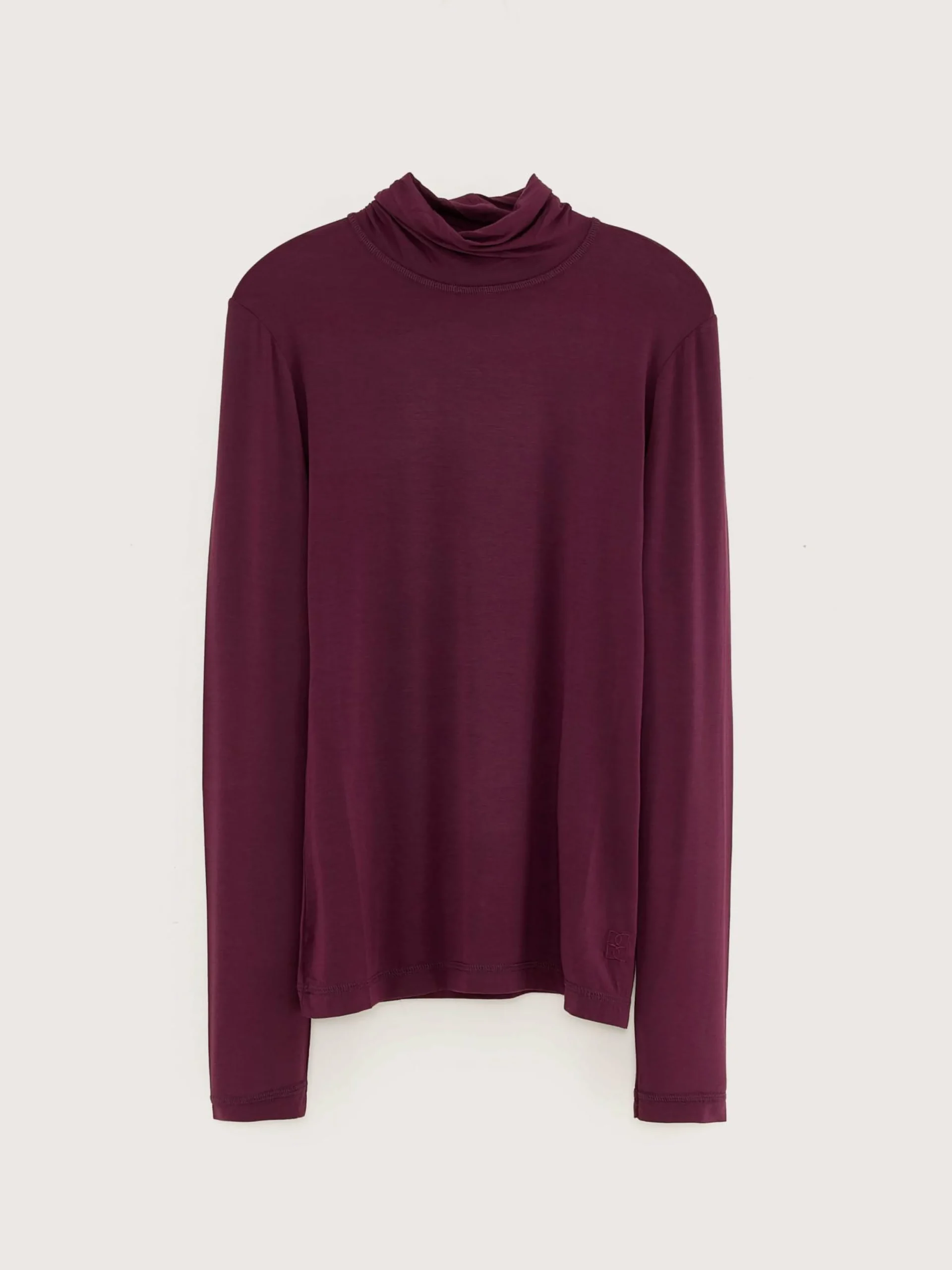 Turtle neck slim fit T-shirt van second skin-stof in bordeauxrood.